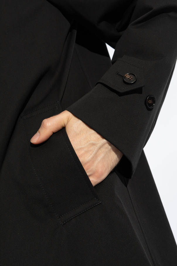 Introducing an epitome of sophistication and timeless style - the Black Cotton Trench Coat by Burberry. Crafted from the finest 100% cotton, this trench coat exudes elegance with its sleek black hue and classic mid-thigh length silhouette. The trench features a round neckline accentuated by a neatly folded collar, presenting an aura of refined grace. The coat\'s front and cuff buttons, meticulously matched in tone with the fabric, add a seamless and polished finish. Long sleeves, equipped with adjustable straps and buttons at the cuffs, allow for a customized fit, further enhancing the coat\'s sophisticated charm. A practical flap pocket detail not only underscores its utility but also adds a touch of distinctiveness. With its precise and durable stitching, this trench coat promises longevity and enduring style. Void of any designer logos or inscriptions, its allure lies in its simplicity and versatility, making it a staple piece that effortlessly complements any wardrobe. Whether dressing for a formal event or a casual outing, this Burberry trench coat transcends occasions, ensuring you always carry an air of elegance and poise. Why Purchase This Product? Exquisite craftsmanship from 100% cotton, offering both comfort and durability. Timeless design by Burberry, ensuring a piece that remains in vogue across seasons. Versatile and elegant, easily paired with various outfits for any occasion. Practical features like a flap pocket and adjustable sleeve straps enhance functionality without compromising style. A testament to minimalist elegance with its buttoned closure hidden beneath a placket, maintaining a sleek and uninterrupted profile.