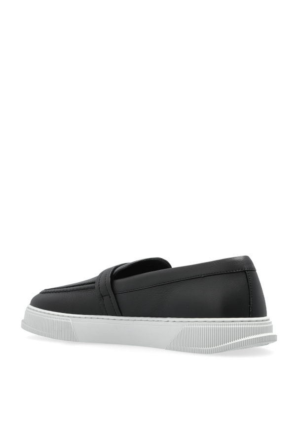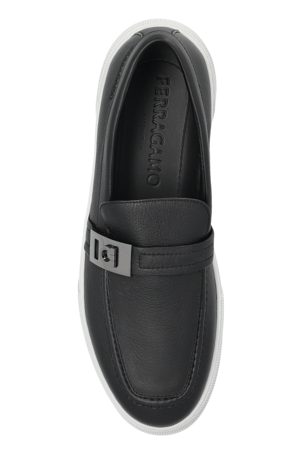 Introducing the Ferragamo Brad Loafers, a distinguished embodiment of elegance and modernity from the renowned Italian designer, FERRAGAMO. Crafted from smooth black leather, these loafers exude an air of sophistication with their classic rounded toe silhouette. The standout feature is their contrasting white rubber sole, delicately grooved for enhanced comfort and a touch of contemporary style. Adorning the front is a silver-tone designer logo buckle, lending a luxurious flair to this timeless piece. The interior, meticulously lined in black leather, features the brand\'s embossed emblem, ensuring every step is a testament to artisanal craftsmanship. Why Choose This Product? Exquisite craftsmanship and premium materials. Tasteful design with a modern twist. Iconic brand synonymous with luxury and comfort. Perfect for elevating any sophisticated ensemble.