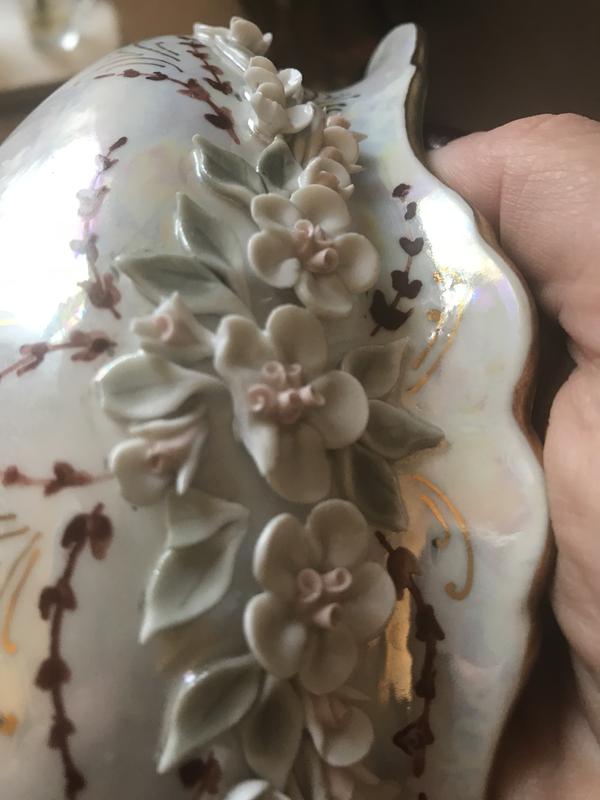 Фарфоровая ваза-тура Кислородского фарфорового завода времен СССР!Ручная лепка! Красивые о»емные цветы рассыпаны по обе стороны изделия. Очень нежная и тонкая ручная работа С нюансов-есть потеря пелесточки на цветке стереосвитшот. фото76. Это можно увидеть только при тщательном осмотре изделия. Сама ваза-перламутрова. Очень интерьерная вещь! Длина -19 см, глубина-9см, ширина-11 см.