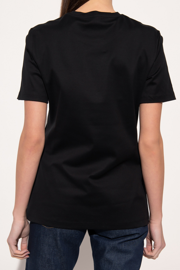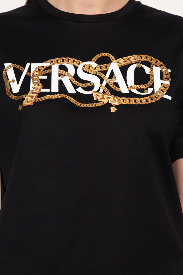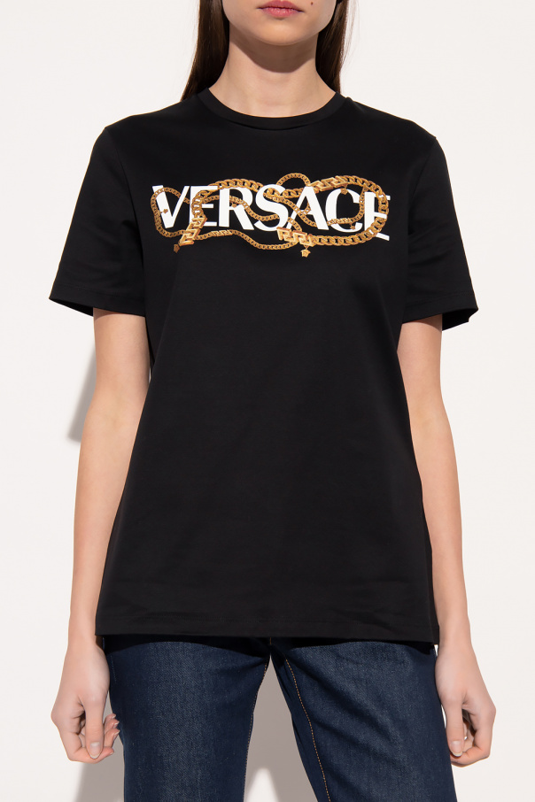 Black crewneck T-shirt from Versace. Made of cotton, this short sleeve design is decorated with a white and gold-tone logo print.