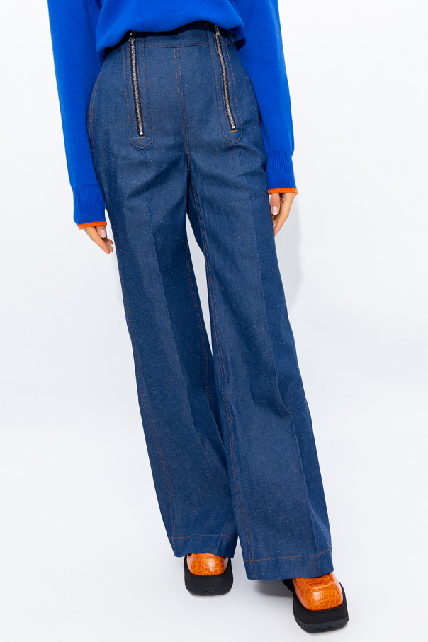 Blue high-waisted jeans from Victoria Beckham. Fastened with decorative buttons, this pair is complete with a logo patch at the back, two front pockets, two back pockets, decorative stitching and flared legs.