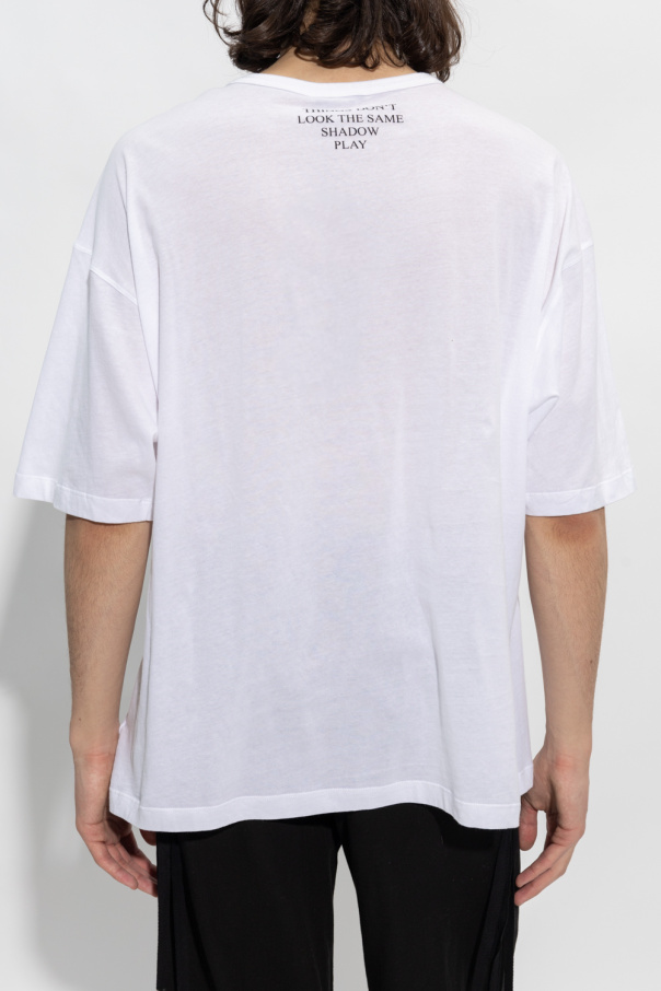 White crewneck T-shirt from Ann Demeulemeester. Made of cotton, this style features a logo print, short sleeves, ribbing on the collar and attached the brand\'s signature straps.