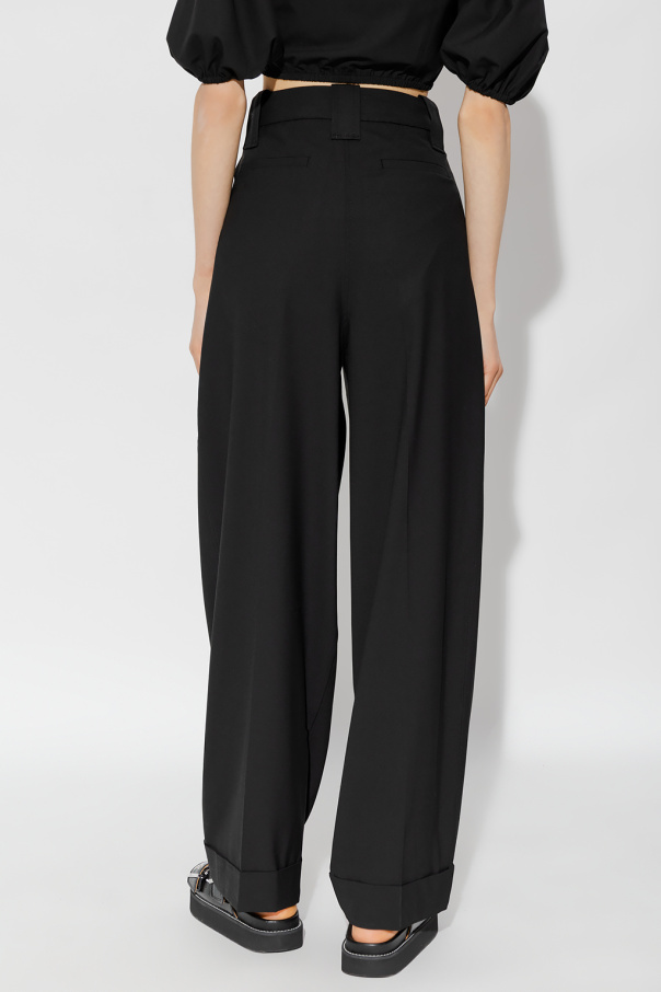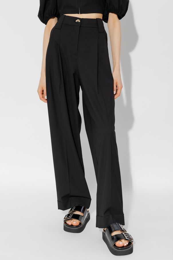 Black pleat-front trousers from Ganni. Crafted in part from LENZING™ECOVERO™ and recycled material, this pair falls with relaxed-fitting legs and features a zip fly with buttons, four slip pockets and turned-up hems.