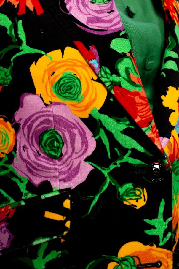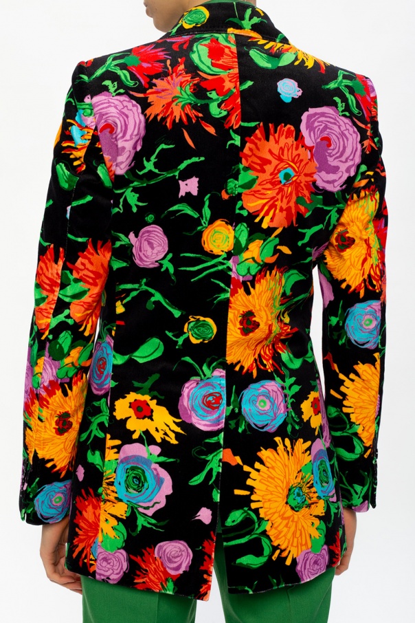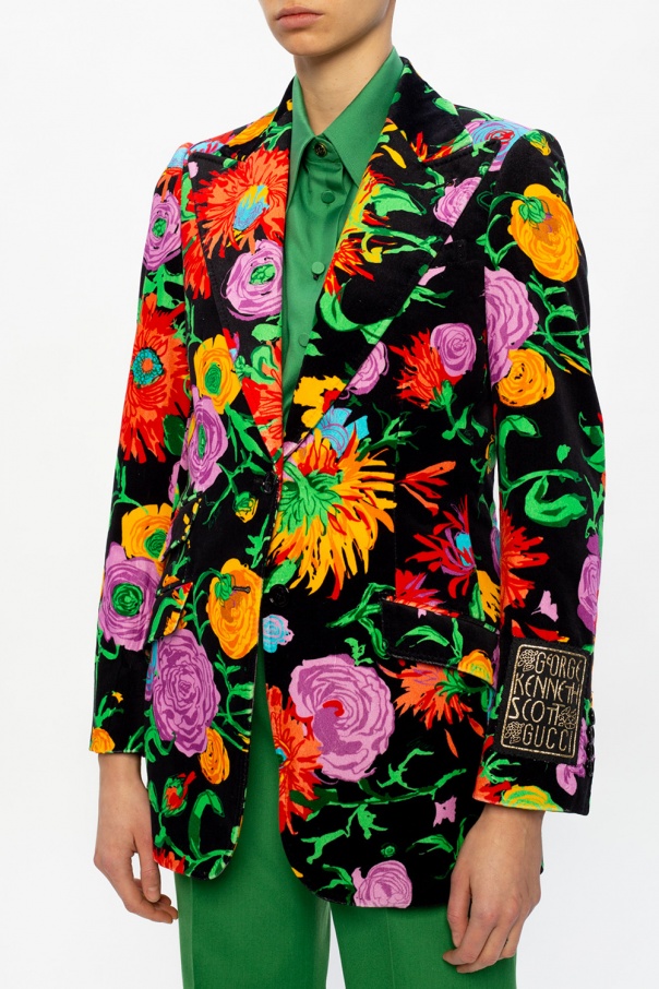Black blazer with notch lapels from Gucci x Ken Scott. Crafted from cotton, this design features button fastenings, colorful floral print, gold-tone logo-embroidered patch, three flap pockets and a slit at the back.