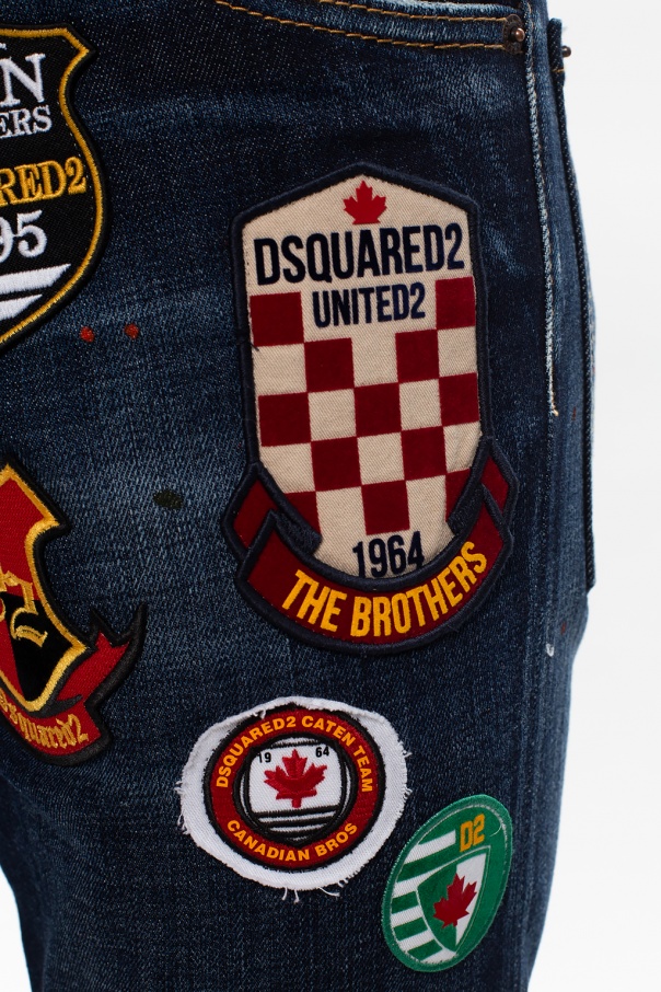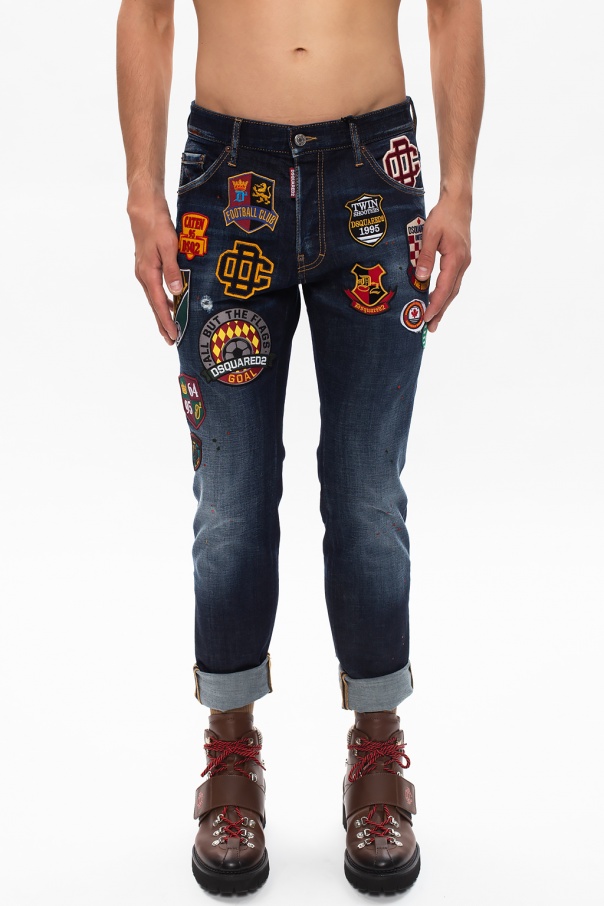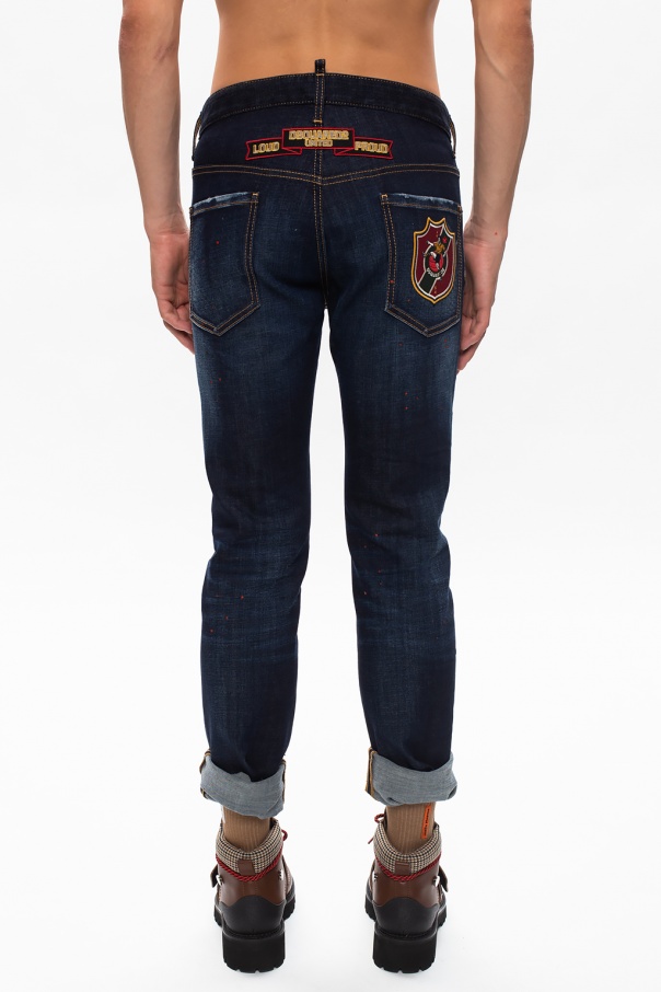 Navy ‘Cool Guy Jeans’ jeans from Dsquared2. Fastened with buttons, this tapered leg design features colourful logo patches, two front pockets and two back pockets.