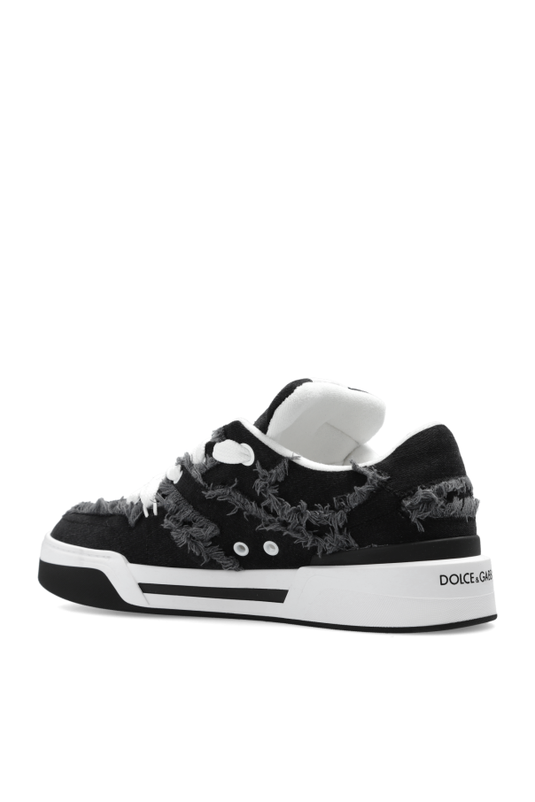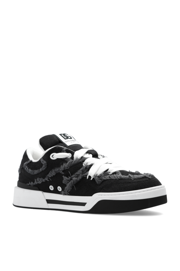 Black and white ‘New Roma’ sneakers from Dolce & Gabbana. Made of denim with a vintage effect, this lace-up pair features a logo patch on the tongue, perforations on the front and rubber sole in black and white.