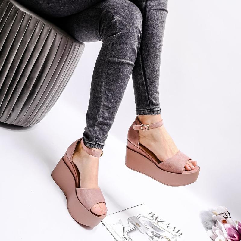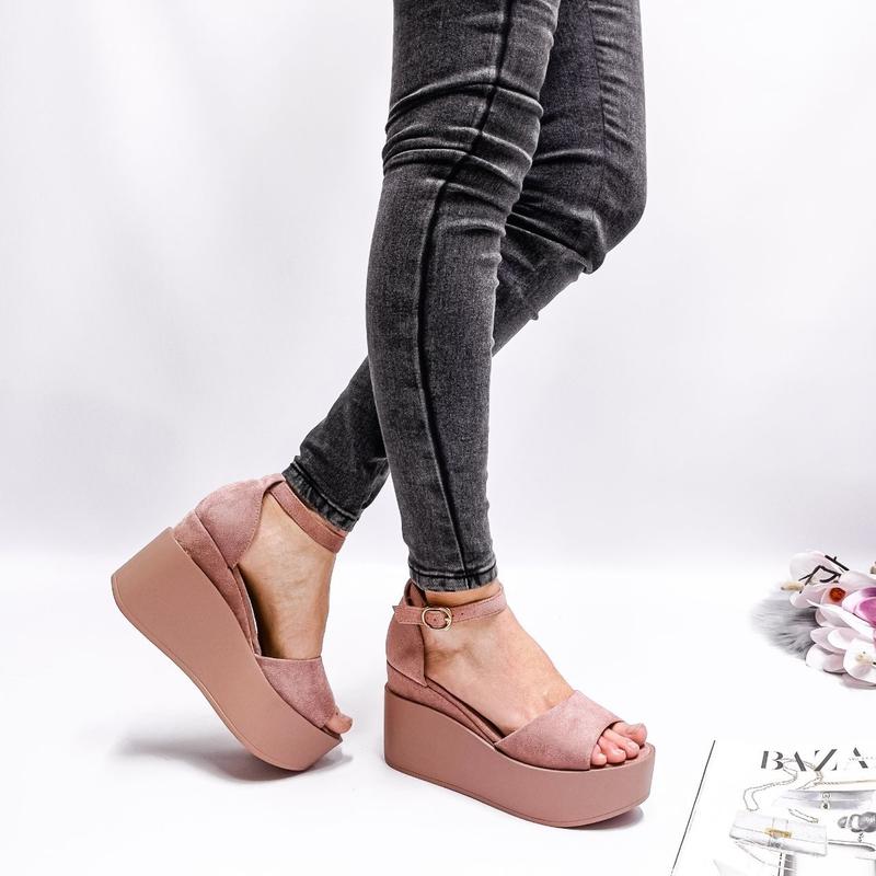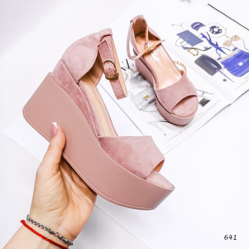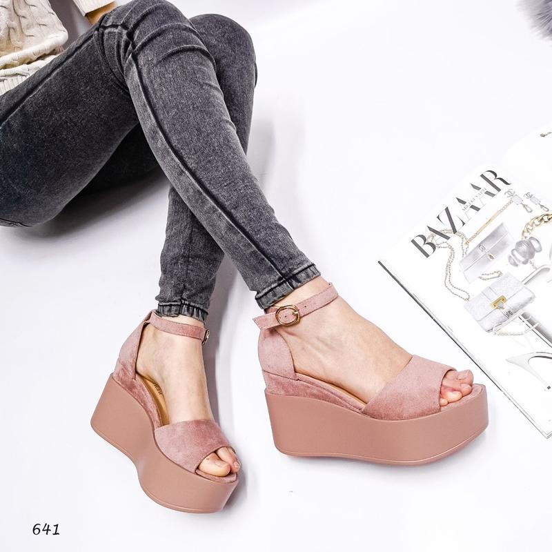 код 641 Жіночі босоніжки Колір -пудра Матеріал -Позов.замш танкетка від п'ятки 6 см від носка 3,5 см Розміри 36-40 устілка - позов.шкіра Виробник - КНР 36=23,5 см 37= 24 см 38= 24,5 см 39= 25 см 40= 26 см Ціна: 680 грн