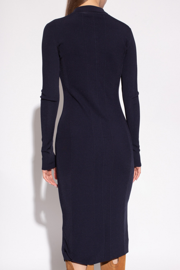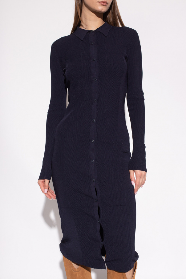 Navy ribbed dress from Rag & Bone. Fastened with buttons, this long sleeve design features a collar.