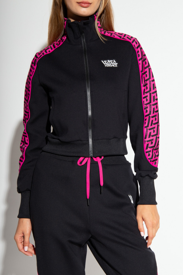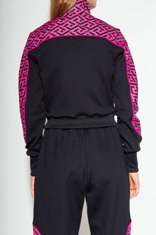 Black and pink sweatshirt with a standing collar from Versace. Embellished with the brand\'s ‘La Greca’ motif, this style features a zip fastening, elasticized trims and two frontal pockets accompanied by a rubber logo patch.