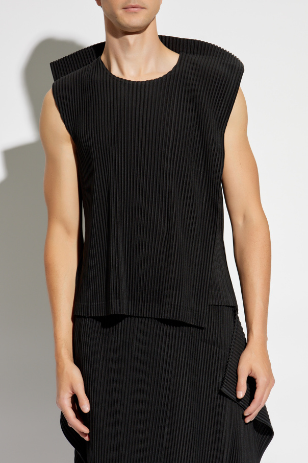 Introducing the exquisite Plisée Top by Homme Plissé Issey Miyake, a masterpiece of design that melds timeless elegance with innovative textile artistry. Crafted from premium 100% Polyester, this piece showcases a sophisticated black hue that exudes elegance and versatility. The top features a graceful round neckline and sleeveless design with distinctive wide shoulders, creating a silhouette that is both modern and flattering. The essence of this garment lies in its meticulously engineered pleats which run vertically across the fabric, providing texture and depth that enhance the body\'s natural contours while offering a comfortable fit. The pleats create an interplay of light and shadow, adding a subtle dynamism to the garment\'s appearance. A classic cut at the front is complemented by an unexpected twist at the back - an asymmetric detail that elongates the material, lending an air of contemporary sophistication. Upon closer inspection, the precision of the pleats reveals a craftsmanship that is second to none, with thin, regular folds that suggest a delicate interplay of shadow and light across the garment\'s surface. This top, devoid of any visible branding or logos, speaks volumes of the designer\'s commitment to minimalism and discretion, ensuring that the focus remains solely on the quality and design of the piece. Why Purchase This Product? Exceptional Craftsmanship: Each top is a testament to the art of pleating, offering a unique texture and depth. Timeless Elegance: The deep black color and sophisticated design ensure this piece remains a versatile staple in any wardrobe. Designer Prestige: Homme Plissé Issey Miyake is renowned for innovative designs that blend tradition with avant-garde aesthetics. Versatile Fit: The pleated construction offers a flexible fit, gracefully accentuating various body types while ensuring comfort.