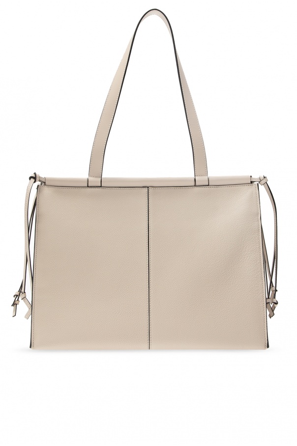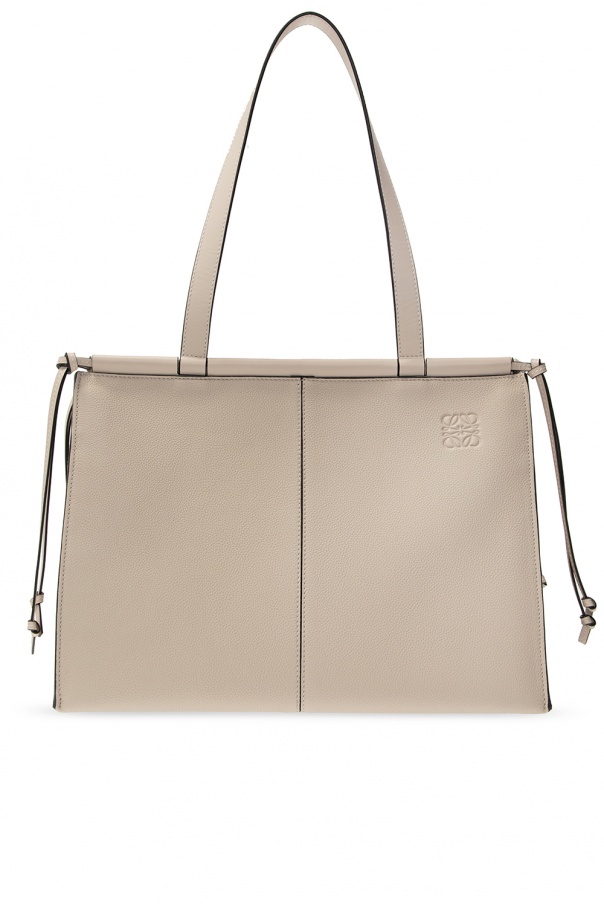 Cream ‘Cushion’ shopper bag from Loewe. Constructed from leather, this design showcases an embossed logo and distinctive fringes. It is complete with magnetic snap fastening and self-tie closure, two half-round handles and interior with one compartment and four slip pockets.