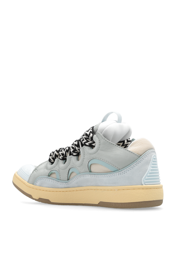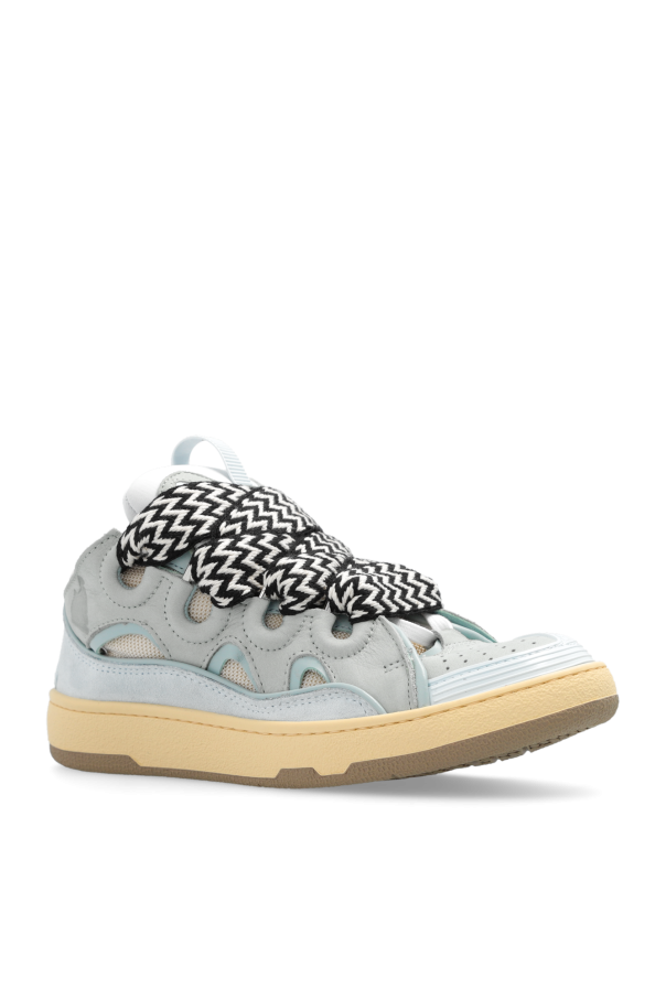 Blue, green and beige ‘Curb’ sneakers from Lanvin. Crafted from leather and fabric overlays with a vintage effect, this lace-up model sits on a beige and brown rubber sole and features an embossed logo, decorative wide shoelaces with a geometrical pattern, perforations on the front and a silver-tone patch.