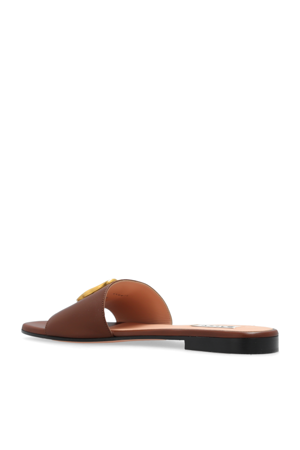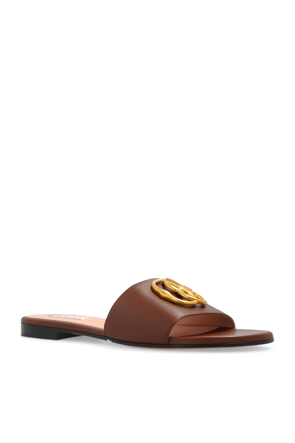 Dark brown slides from Bally. Made from lamb leather, this model sits on a light pink leather sole and features a gold-tone logo application on the front.