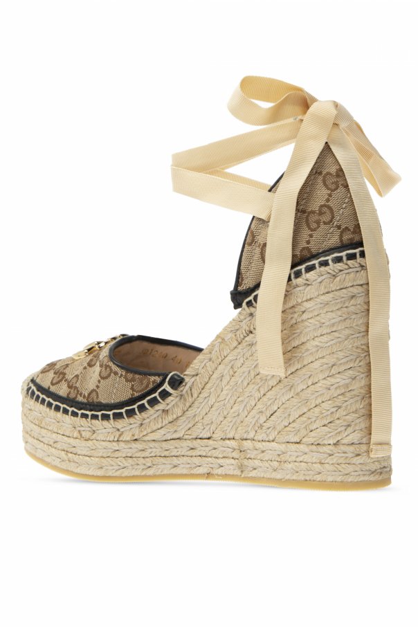 Beige, brown and black wedge espadrilles from Gucci. Made of ‘GG Supreme’ canvas. Decorated with an embroidered logo pattern and a metal logo in gold-tone. Beige rubber sole.