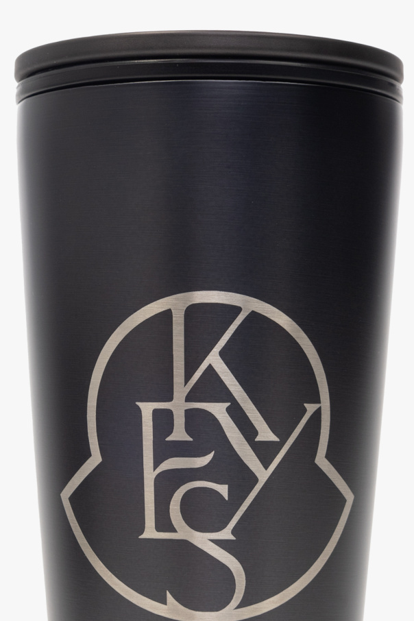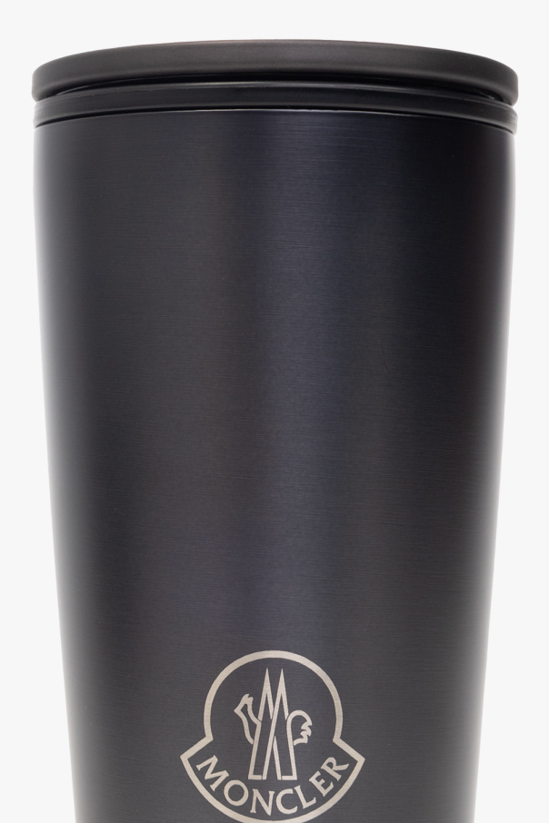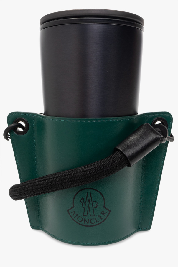 Travel mug and holder set from Moncler Genius, the ‘2 Moncler Alicia Keys’ collection. The black travel mug is made from stainless steel and features a leak-proof magnetic lid with flip top opening and a silver-tone logo detail. It holds temperature – hot or cold – for 12 hours. The green holder is crafted from leather, printed with a black logo and comes with a detachable black shoulder strap.