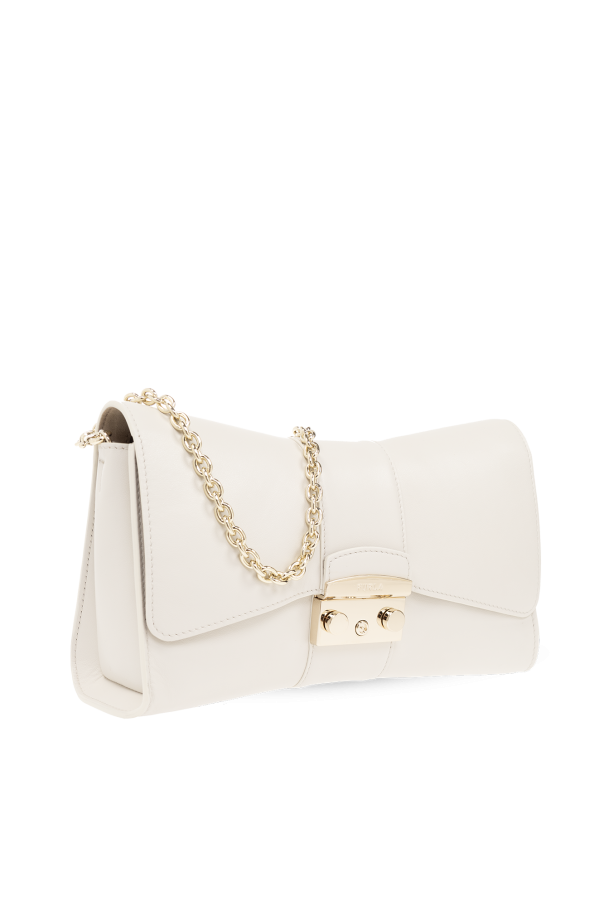 Light grey ‘Metropolis Remix Small’ shoulder bag from Furla. Made of leather, this design features a logo-engraved snap closure, detachable chain, gold-tone metal hardware and one internal compartment with one zip pocket.