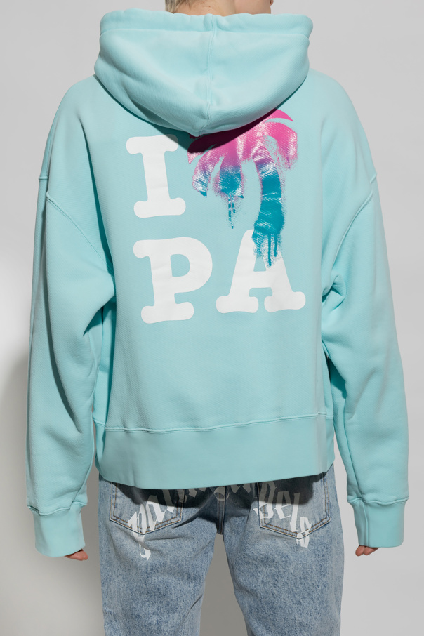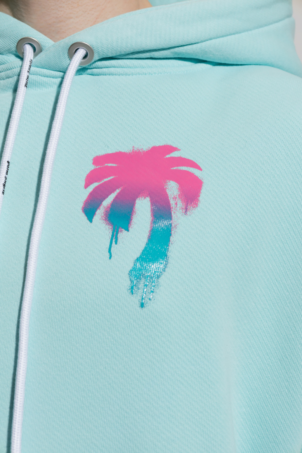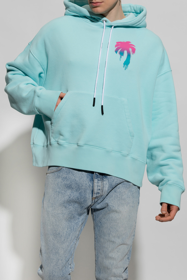 Blue sweatshirt with a drawcord-adjustable hood from Palm Angels. Crafted from cotton jersey, this style features long sleeves, kangaroo pocket, elasticized trims and a blue and pink palm tree graphic accompanied by a white logo.