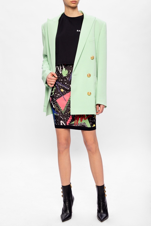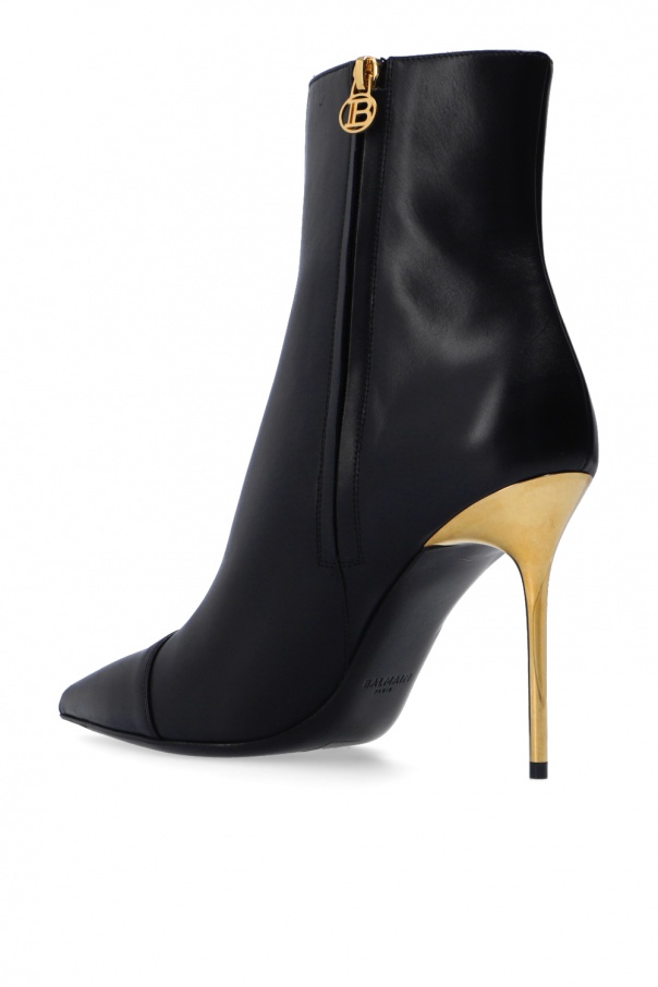 Black heeled ankle boots from Balmain. Crafted from calf leather, this design features a side zip, logo-embossed appliqués in antiqued gold-tone, pointed toe and black leather sole.