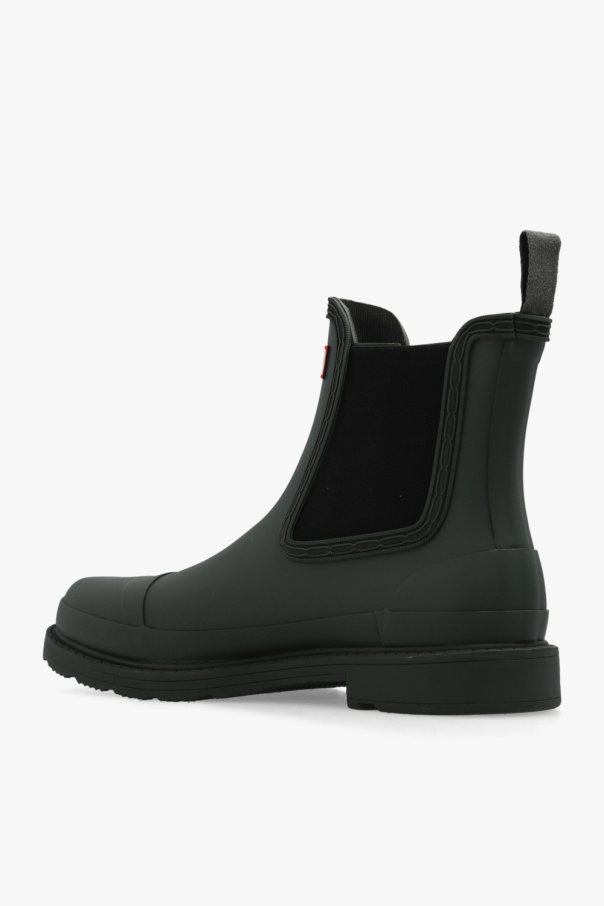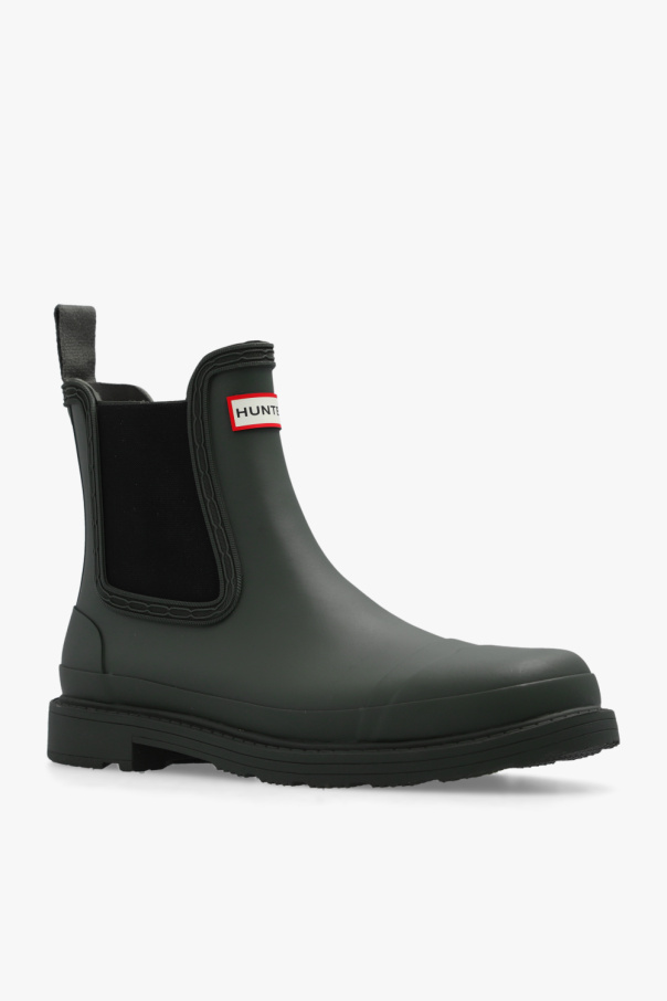 Green ‘Commando Chelsea’ rain boots from Hunter. Handcrafted from natural FSC®-certified, natural rubber with a matte finish, this model features a logo application on the front, elastic panels on the sides, decorative trims, a back pull tab and rubber moulded outsole with Hunter Original tread pattern.