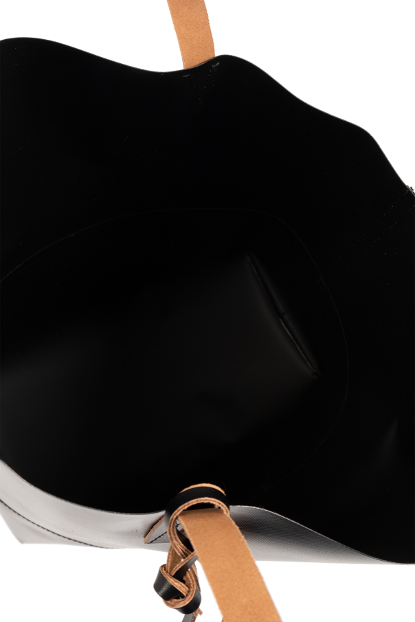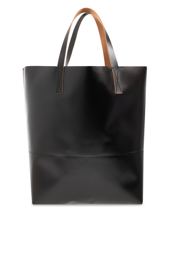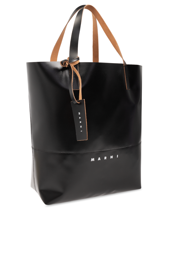 Black ‘Tribeca’ shopper bag from Marni. Made of plastic and trimmed with leather, this design showcases a printed white logo on the front, two half-round handles accentuated with a logo-embossed pendant, and one internal compartment.