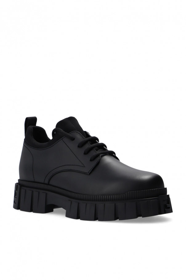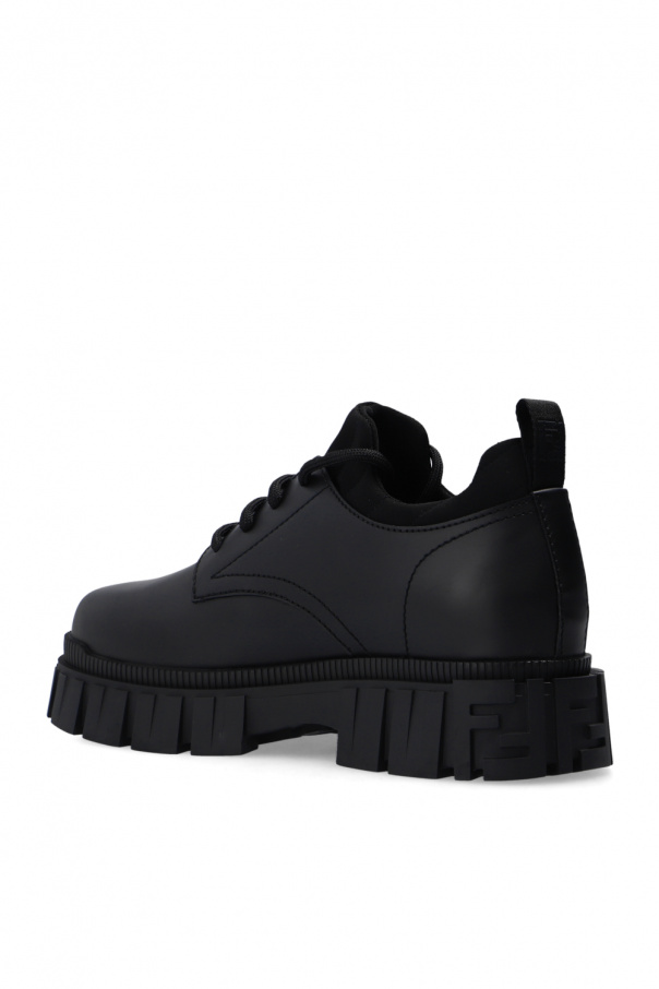 Black boots from Fendi. Crafted from leather, this lace-up pair features a raised logo at the back and a black rubber sole.