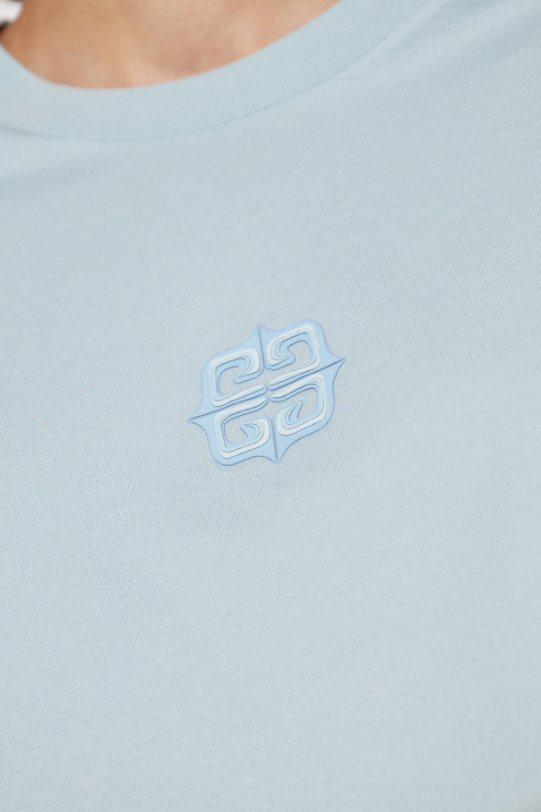 Introducing the T-shirt with Logo from the exclusive Givenchy collection. This light blue short T-shirt exemplifies simplicity and elegance, boasting subtle details that reflect the high-quality craftsmanship and attention to detail typical of luxury fashion brands. Crafted from premium, smooth cotton, this T-shirt ensures unparalleled comfort. Its loose, wide fit with short sleeves and cropped length that reaches the waist lends a modern, fashionable appeal. The T-shirt is monochromatic, adorned with a discreet, embroidered logo on the chest, and features a barely visible brand name on the back, adding a touch of sophistication and discretion. The logo\'s rubberized finish further accentuates its unique character. Why Choose This Product? Elegant Design: A chic light blue hue with a minimalist aesthetic. Premium Material: Made from 100% high-quality cotton for ultimate comfort. Subtle Branding: Features a tasteful embroidered logo and a barely visible brand name for a refined look. Versatile Style: Perfectly pairs with light jeans and a long beige coat for both casual and elegant ensembles.