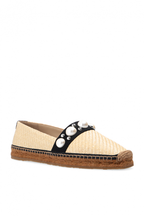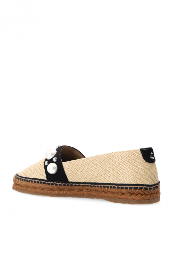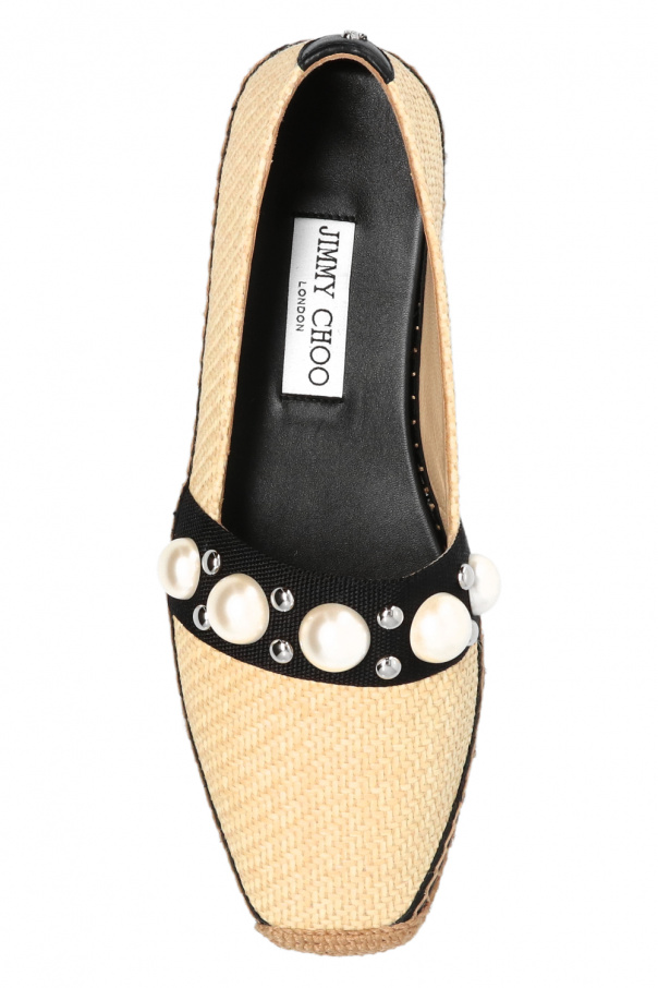 Cream and black ‘Dru’ espadrilles from Jimmy Choo. Resting on a beige rubber sole, this pair is decorated with glass pearls, studs and a logo detail in silver-tone.