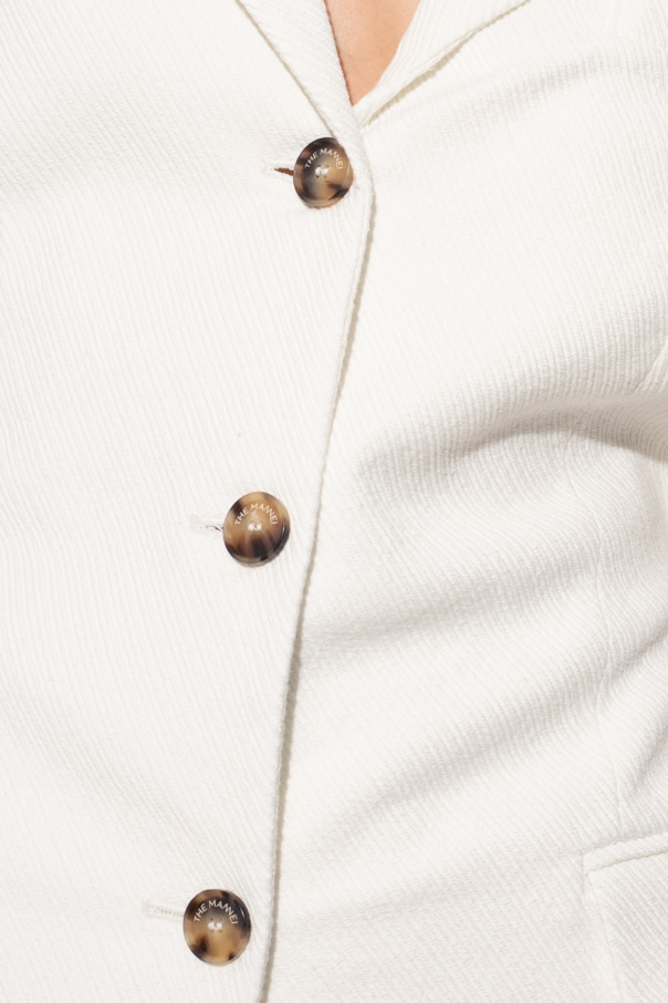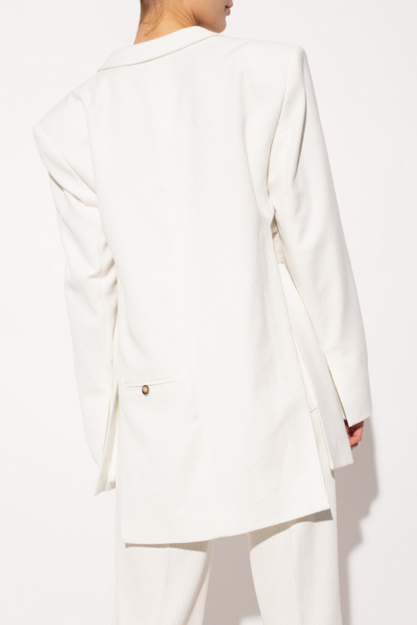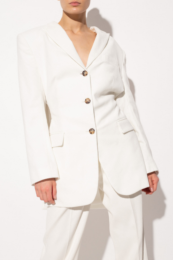 White ‘Edynburg’ blazer from The Mannei. Crafted from a ribbed cotton knit, this style features button fastenings, peak lapels, two flapped pockets, one slip pocket, long sleeves, deep vents to the sides and a button-up belt accompanied by a single pocket on the back.