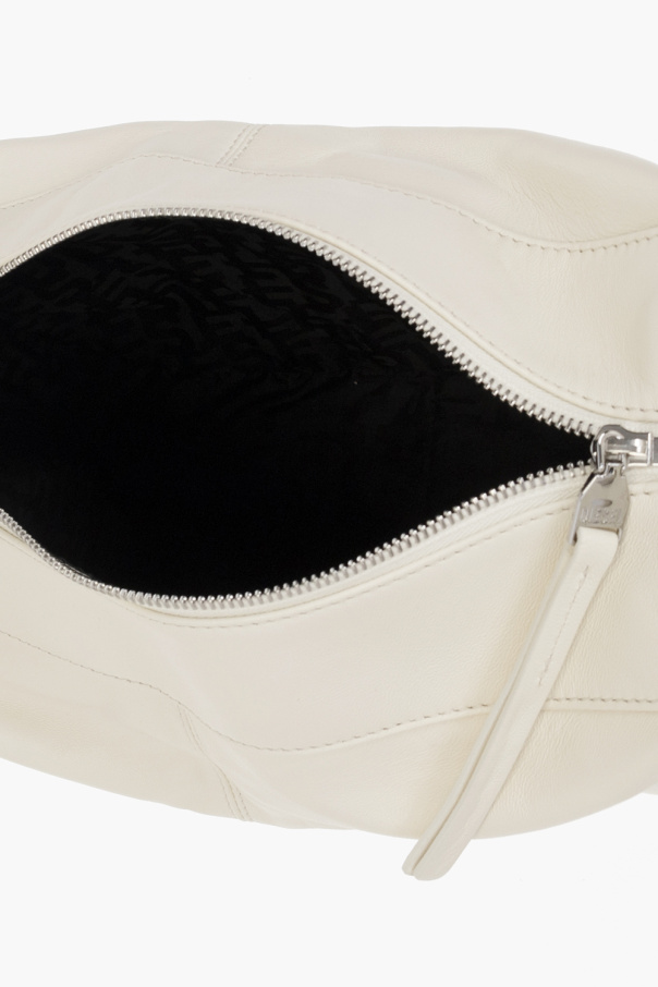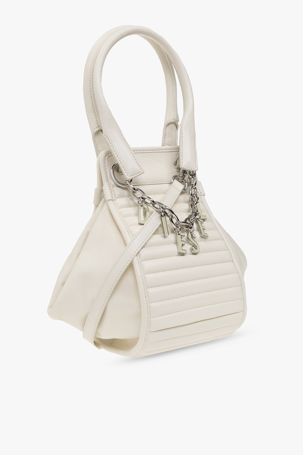 Cream ‘D-VINA-RR S’ shoulder bag from Diesel. Crafted from leather, this design secures with a zipper and magnetic snaps and showcases decorative quilting, a detachable chain with a logo, two half-round handles, a detachable and adjustable shoulder strap, silver-tone metal hardware and one internal compartment with one zip pocket and one slip pocket.