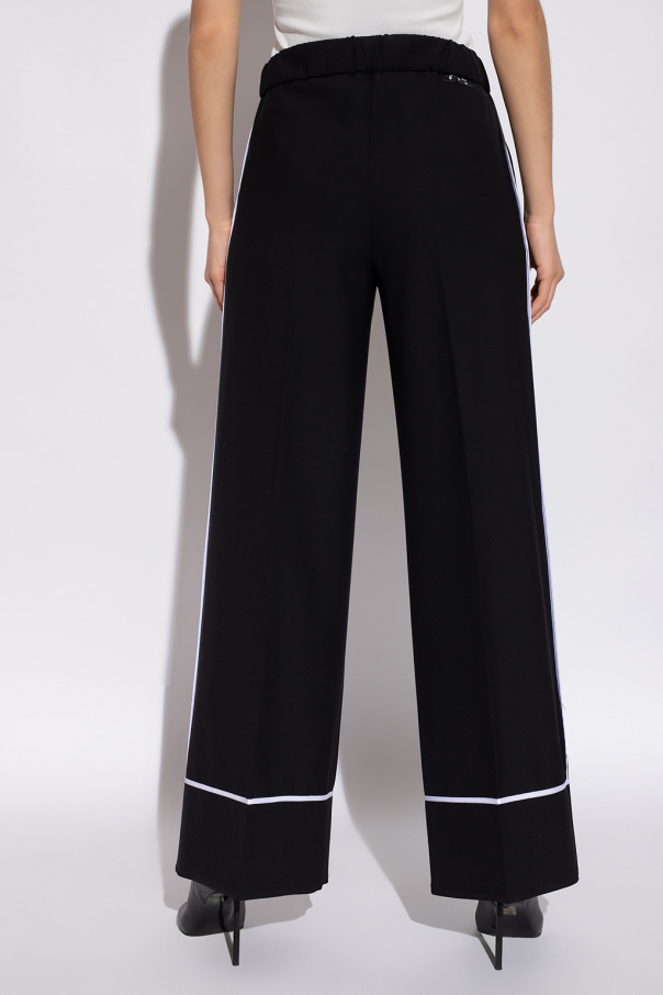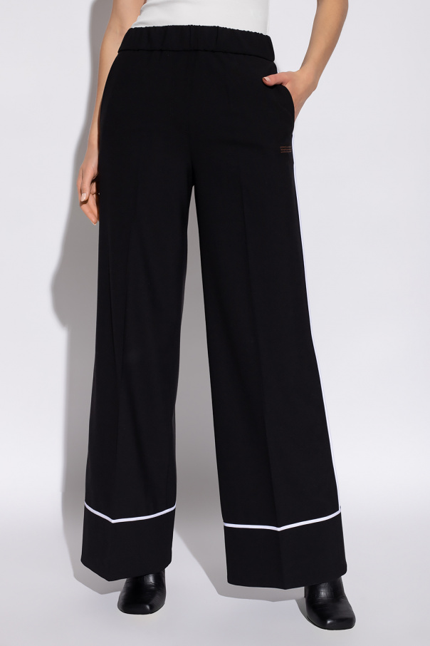 Black trousers from Off-White. This wide leg design features an elastic waistband, a printed pattern with an orange logo, white side stripes and two slip pockets.