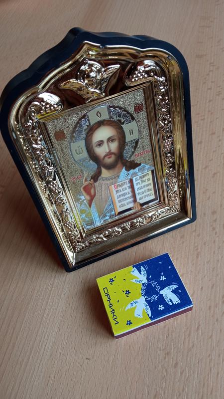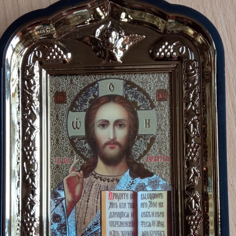 икона совершенно новая.в пластиковом черном корпусе.можно ставить на стол.фоьо сзади выдвигается ножка или стену там ды́рочка есть.все серебристо золотистое.размер-высота-13.5 см.ширина9.3см.толщина-1.7 см..