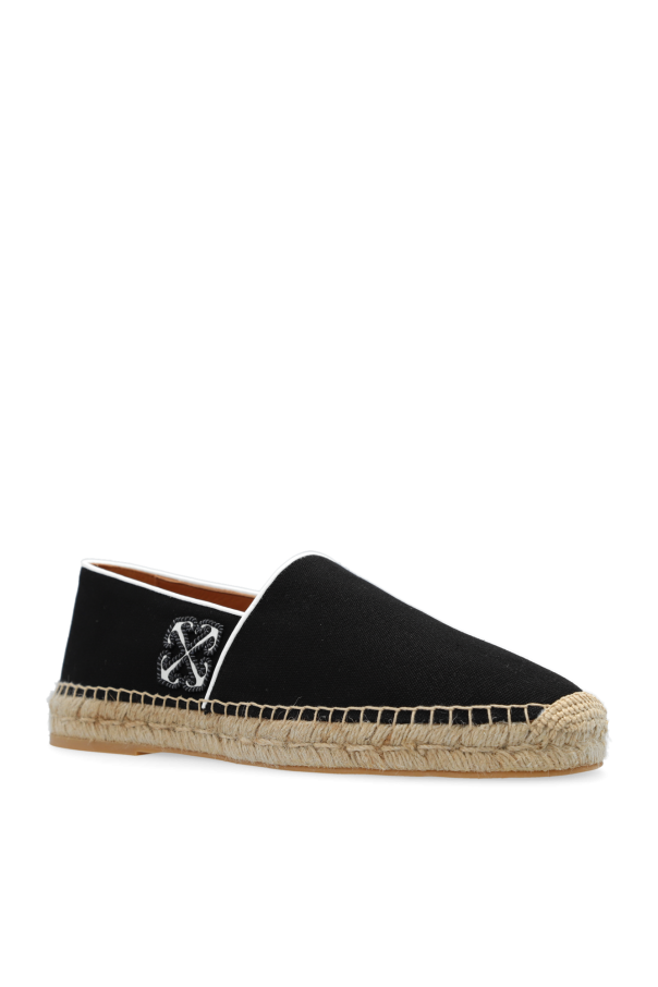 Black ‘Anglette’ espadrilles from Off-White. Made from cotton, this model sits on a beige rubber sole with a jute overlay and showcases a white and black patch in the shape of signature arrows on the side.
