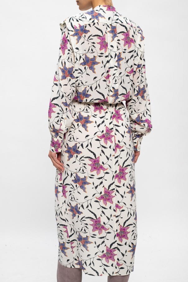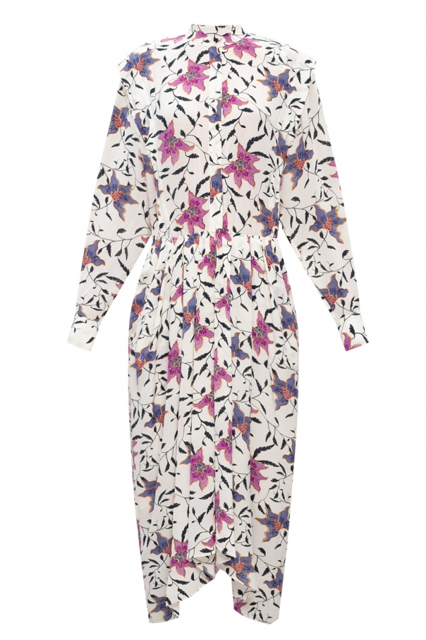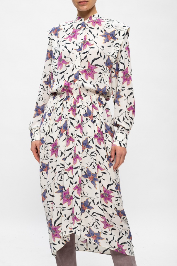 Cream dress from Isabel Marant Étoile. Illustrated with a colourful graphic pattern, this style is complete with a button fastening on the front, an elasticated trim at the waist, two welt pockets, gathered details and long sleeves.