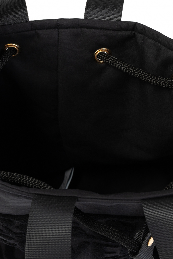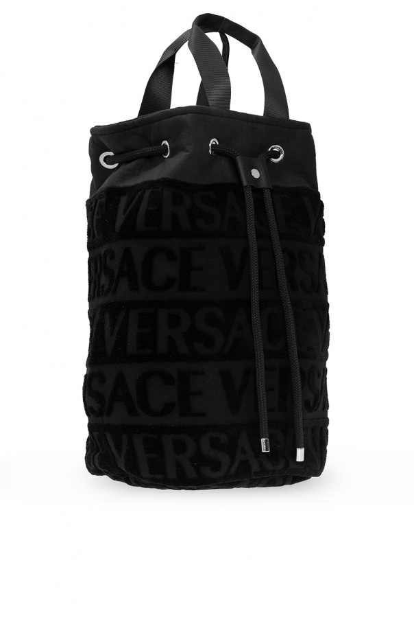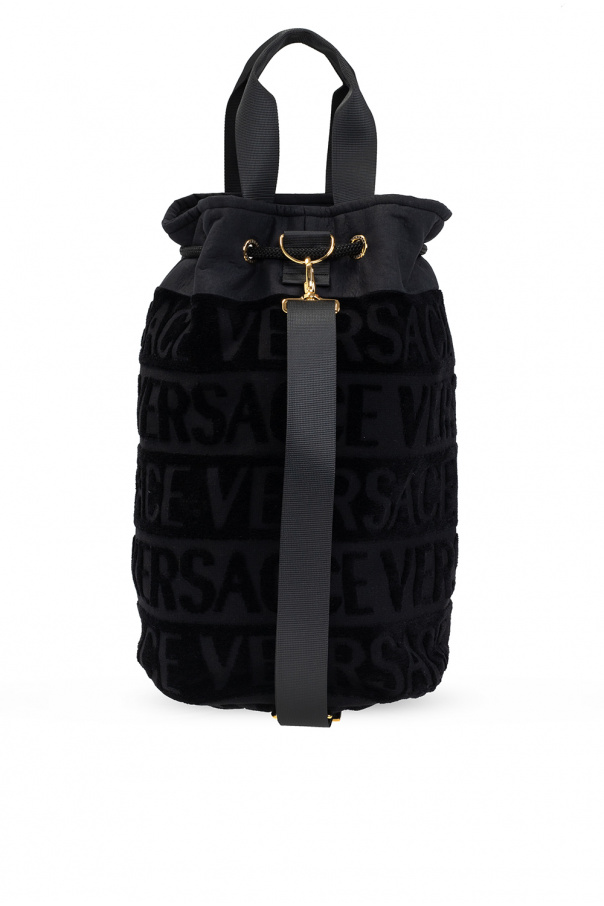 Black beach bucket bag from Versace. Crafted from cotton and embroidered with the brand\'s logo, this design cinches closed with a drawstring and features two half-round handles, a detachable and adjustable shoulder strap, gold-tone metal hardware and one internal compartment with a snap-fastened pocket.