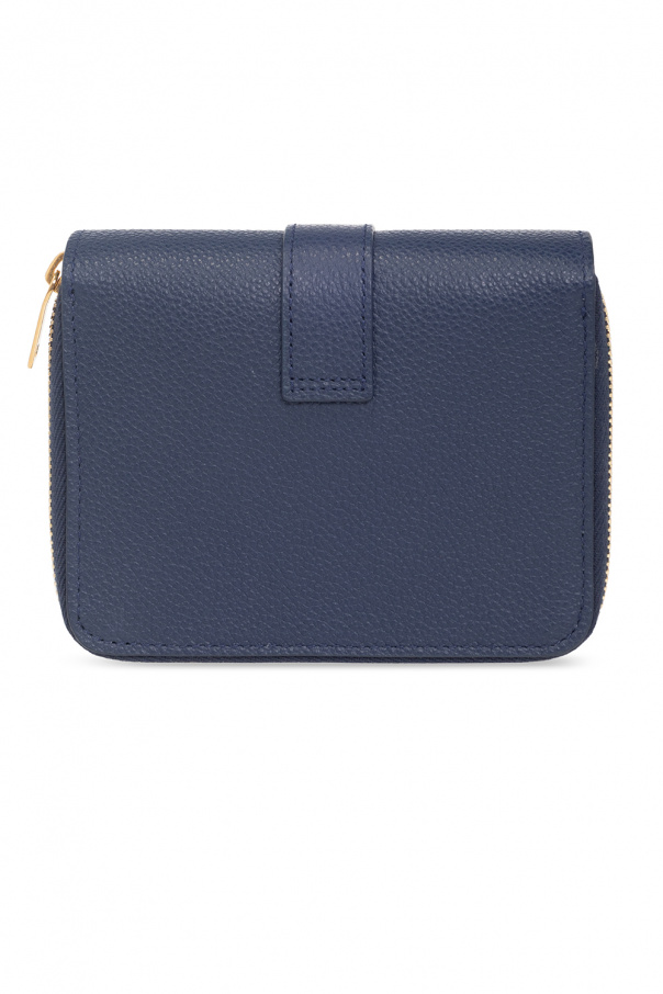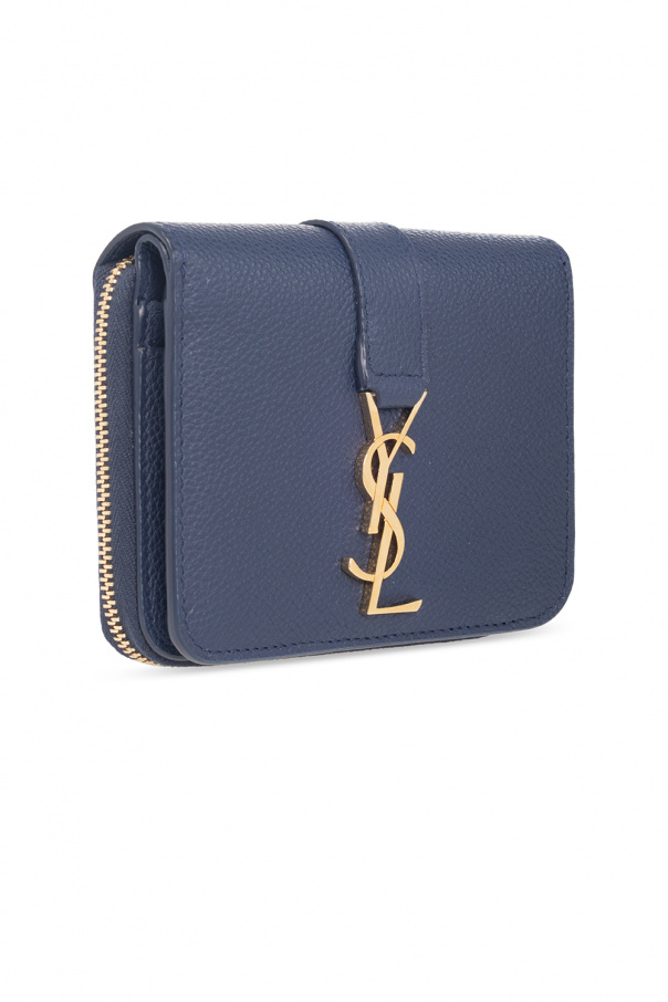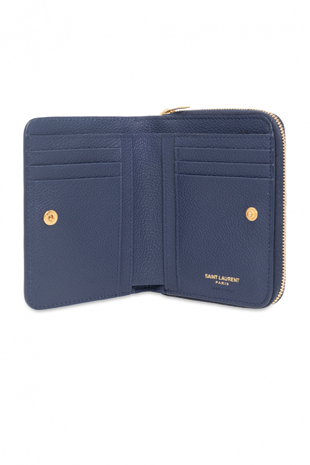 Navy wallet from Saint Laurent. Made of calf leather, this model features a snap closure, metal logo appliqué in gold-tone, zipped coin pocket at the back and gold-tone metal hardware. It has a bill compartment, four slip pockets and six card slots.