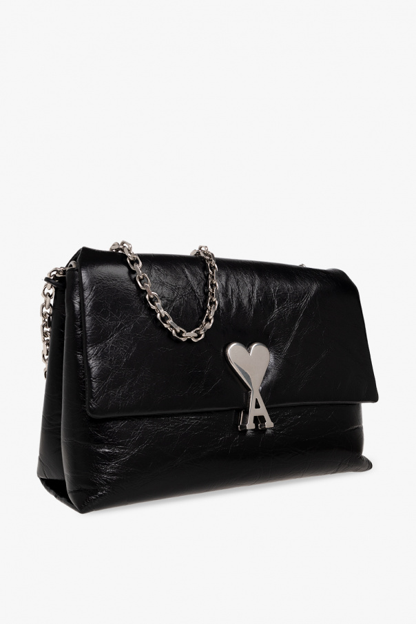 Black ‘Voulez-Vous’ shoulder bag from Ami Alexandre Mattiussi. Made of leather with a vintage effect, this model features a magnetic closure with the Ami de Coeur logo appliqué, shoulder chain, silver-tone metal hardware and two separate internal compartments with one zip pocket and one slip pocket.