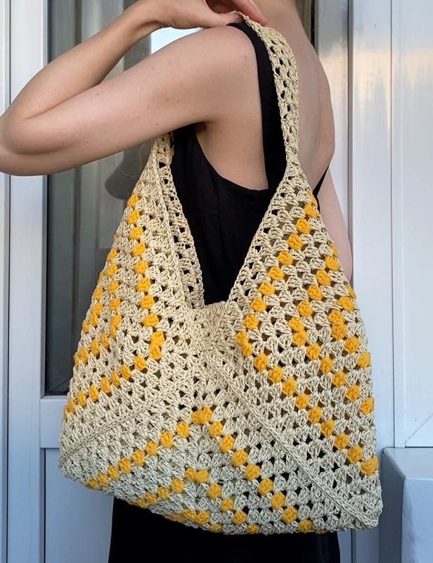 Материалы: рафия (100% целлюлоза) и хлопковая пряжа (желтый)
