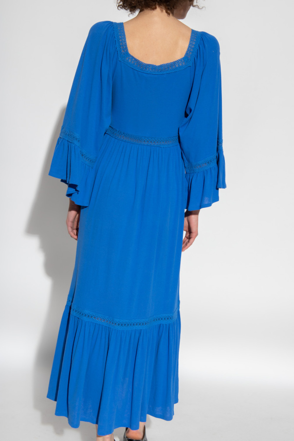 Blue dress from See By Chloe. Made of cotton, this style features a square neckline, decorative stitching details, lace trims and wide, three-quarter sleeves with a ruffle.