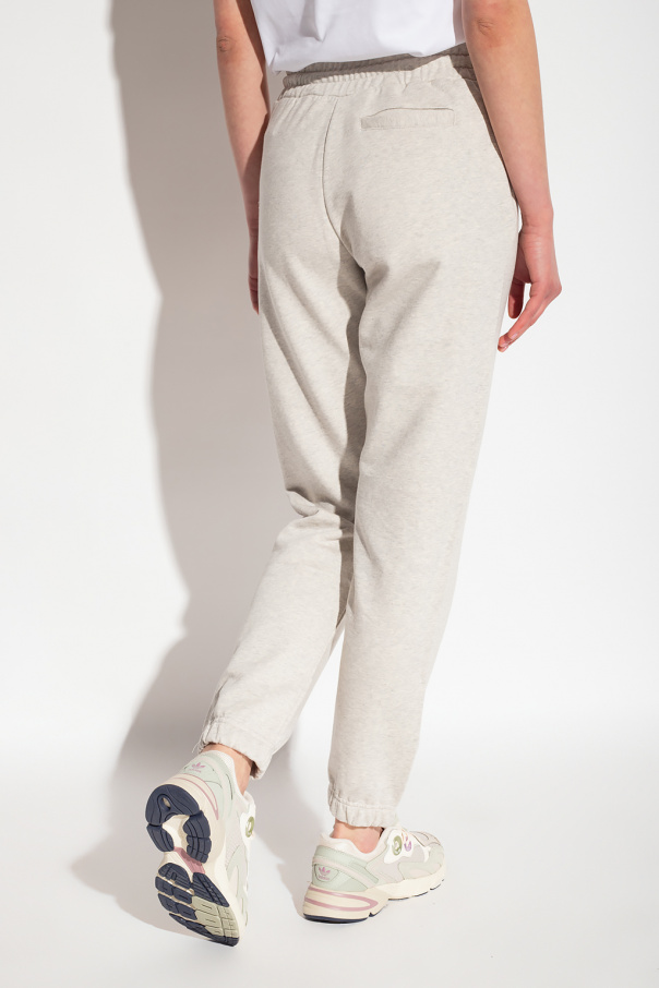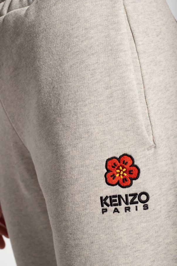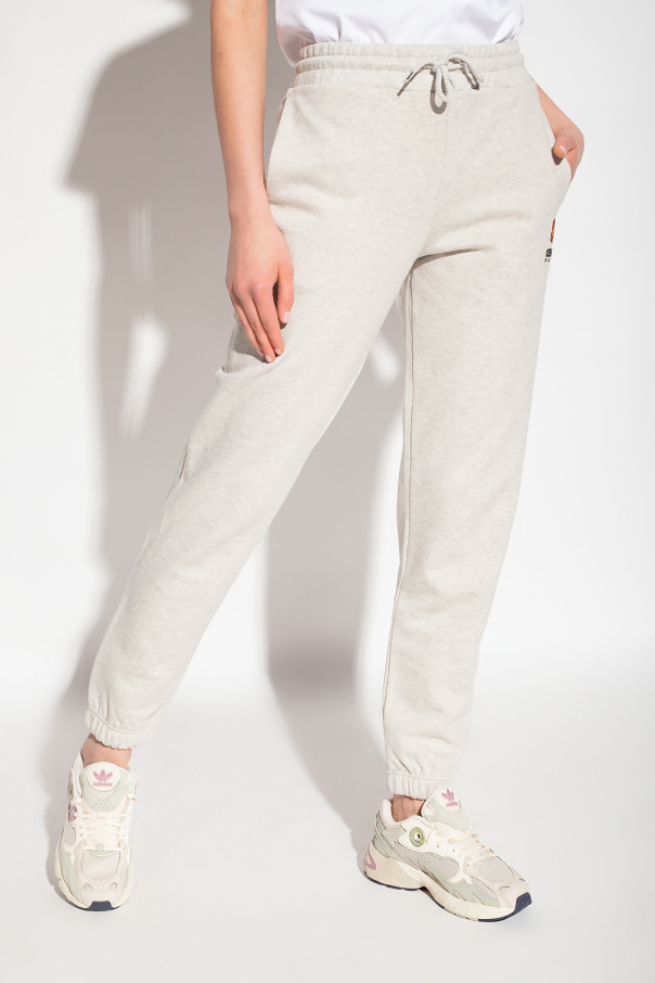 Grey sweatpants from Kenzo. Crafted from cotton, this pair is complete with an elastic waistband with drawstrings, a black logo embroidery, floral patch, three slip pockets and elasticated cuffs.