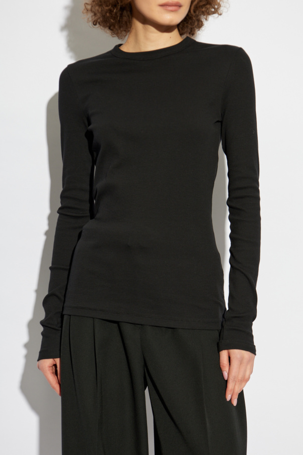 Introducing the Ribbed Long-Sleeve Top from the illustrious designer TOTEME. This exquisite piece is a hallmark of refined minimalism, woven with the spirit of urban sophistication. Crafted from a sumptuous blend of cotton and elastane, the fabric gracefully contours to the body, accentuating the silhouette with its sleek, ribbed texture. The top boasts a fitted silhouette, complete with long sleeves and a classic round neckline, offering a versatile addition to any wardrobe. Its timeless black hue ensures it can be effortlessly paired with a myriad of ensembles, making it a quintessential staple for the discerning fashion aficionado. Why Choose This Product? Exclusive design from the renowned brand, TOTEME. Crafted with a premium cotton-elastane blend for comfort and flexibility. Minimalistic elegance with no visible logos for a clean, sophisticated look. Adaptable black color, perfect for various styling options.