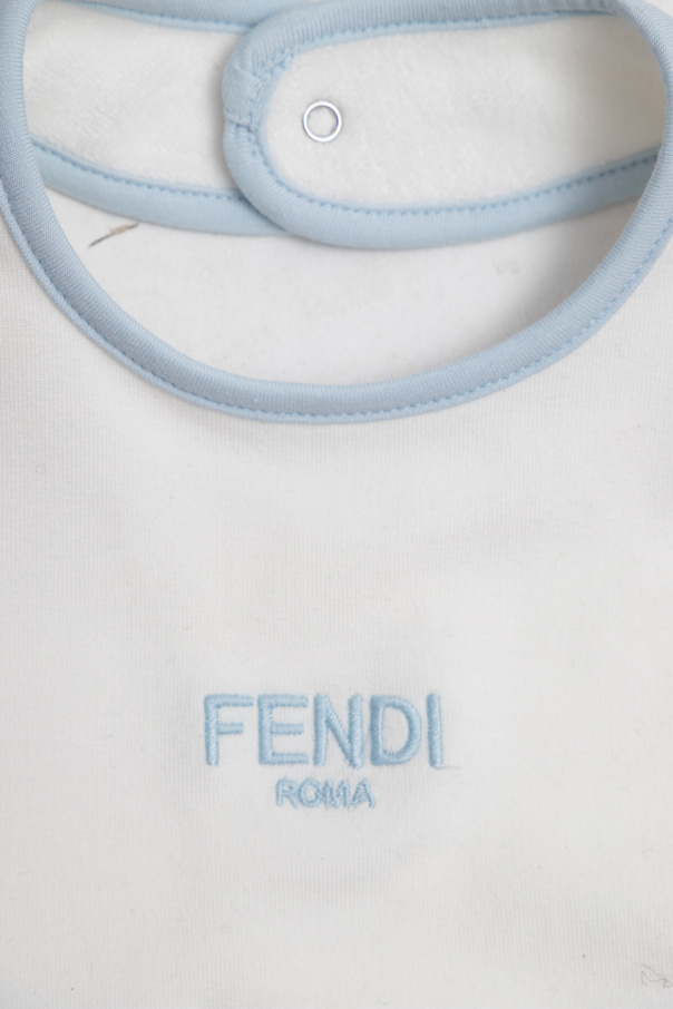 Blue and white babygrow, hat & bib set from Fendi Kids. Made of cotton, each item showcases the brand\'s logo.