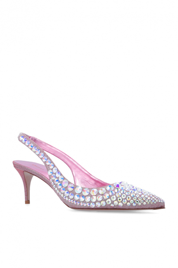 Purple ‘Mabel’ pumps from Le Silla. Made of fabric and inlaid with lurex yarn, this model showcases a pointed toe silhouette with sparkling crystals, an open heel and a beige sole in leather and rubber.
