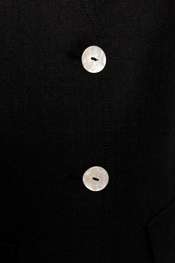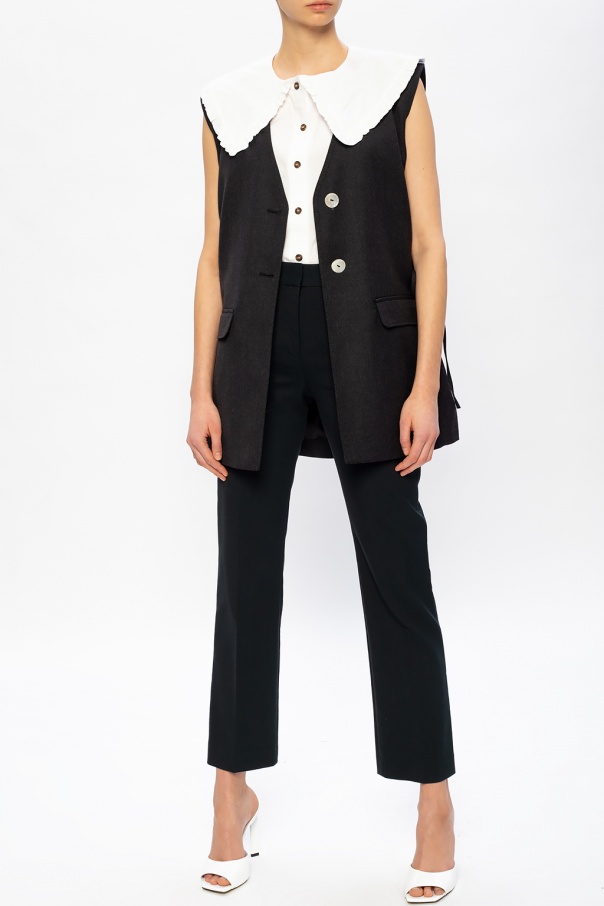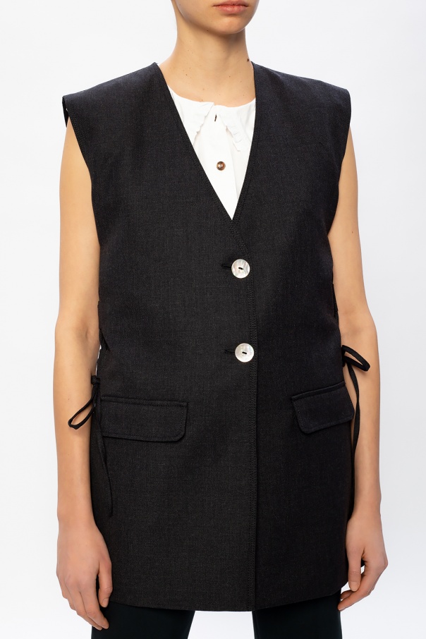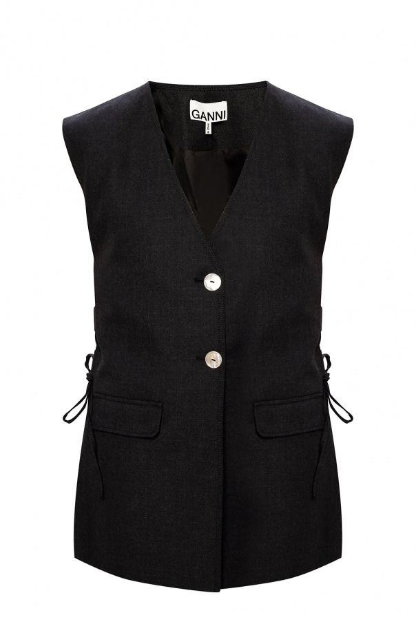 Dark grey vest from Ganni. Finished with wool, this style features distinctive button closures, two flapped pockets and a self-tie detail for a gathered waist effect.