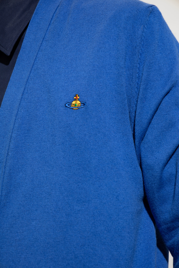 Blue cardigan from Vivienne Westwood. Made from a blend of organic cotton and cashmere, this style features an embroidered colourful logo on the front, button fastenings, two slip pockets, long sleeves and ribbed trims on the bottom hem and cuffs.
