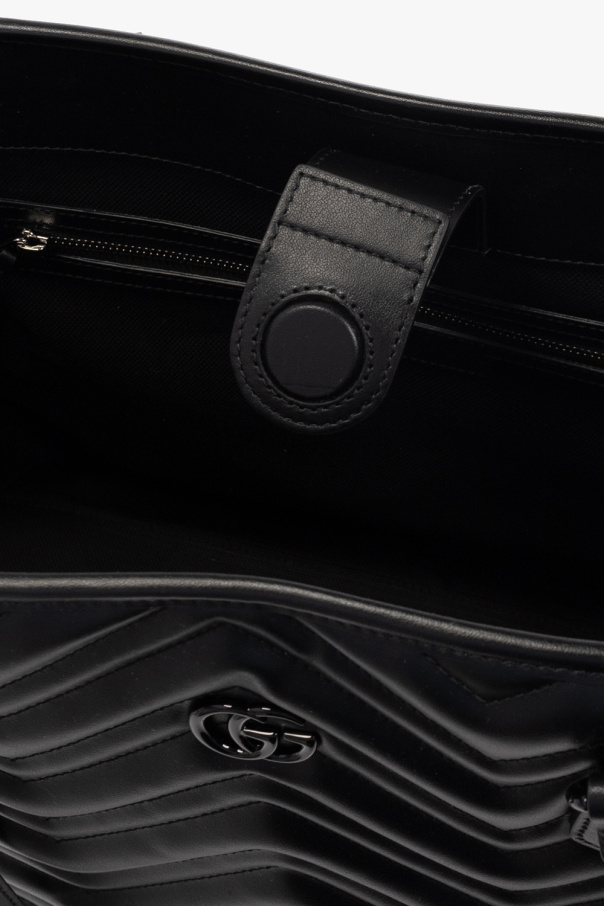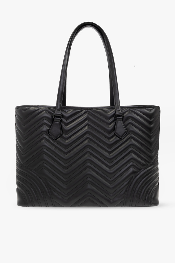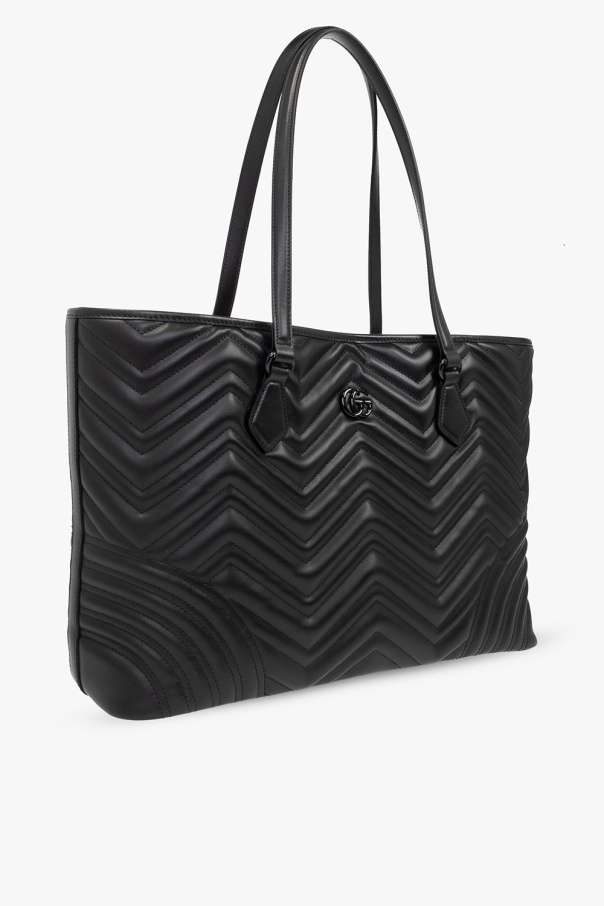 Black ‘GG Marmont’ quilted shopper bag from Gucci. Crafted from calf leather, this design secures with a magnetic fastener and showcases ‘Double G’ hardware on the front, two half-round handles and one internal compartment with one slip pocket and one zip pocket.