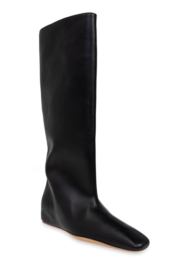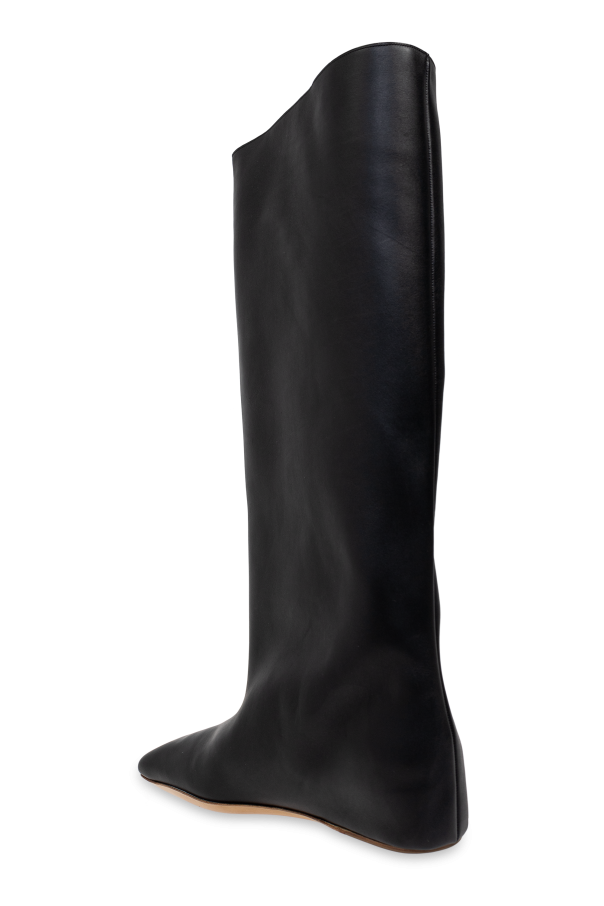 Introducing the epitome of understated elegance: JIL SANDER\'s Leather Boots. Meticulously crafted with a smooth leather exterior, these boots exude a polished charm with their classic, straight silhouette and subtly rounded toe. The seamless shaft reaches gracefully to the knee or just above, ensuring a sophisticated profile from every angle. The boots\' material composition combines an outer layer of supple leather with an interior lining of the same high-quality material, promising both durability and comfort. The rubber-leather composite sole adds an intriguing contrast in a lighter hue against the deep black of the leather, providing a discrete yet captivating design detail. The absence of external branding or logos accentuates the boots\' minimalist aesthetic, with only delicate stitch lines weaving through the design to subtly highlight their exquisite craftsmanship. Designed for ease and elegance, these slip-on boots with a hidden wedge offer both height and comfort, making them a versatile addition to any wardrobe. Why Purchase These Boots? Handcrafted with premium leather materials for longevity and comfort. Timeless knee-high silhouette that enhances any outfit with an air of sophistication. Minimalist design with subtle detailing for a universally appealing aesthetic. Practical slip-on style with a hidden wedge for an effortless blend of elegance and functionality.
