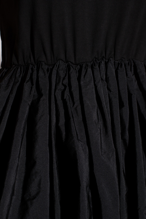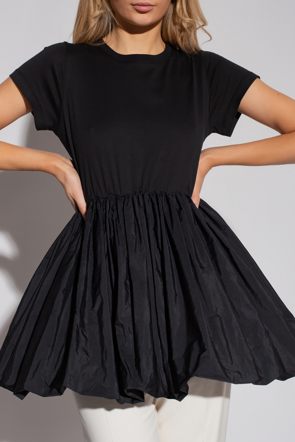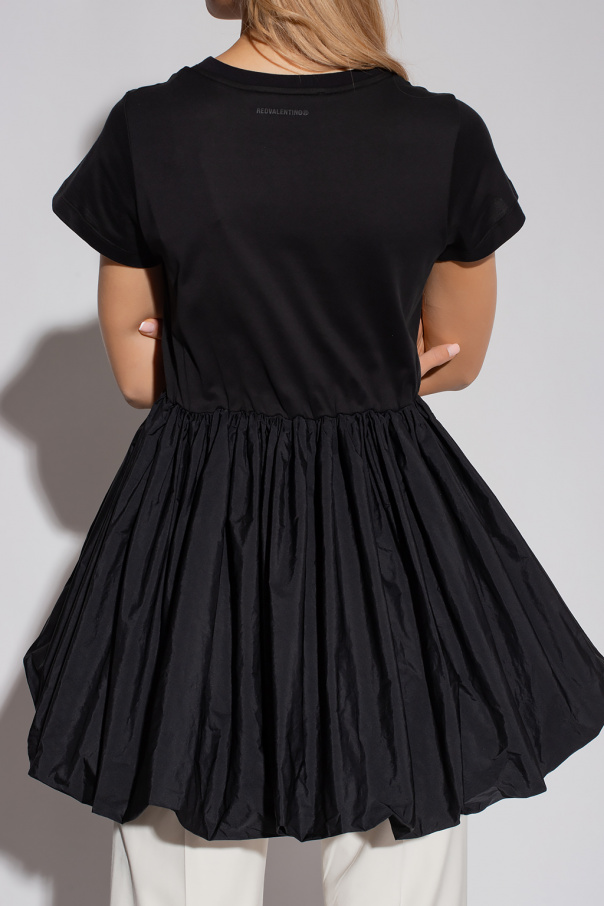 Black dress from Red Valentino. Crafted from cotton and taffeta, this style features a crewneck T-shirt bodice with short sleeves and a back logo print, as well as a puff, gathered skirt.