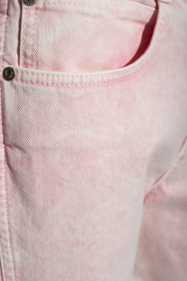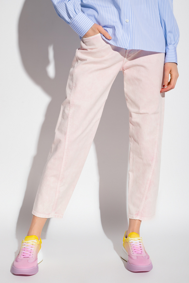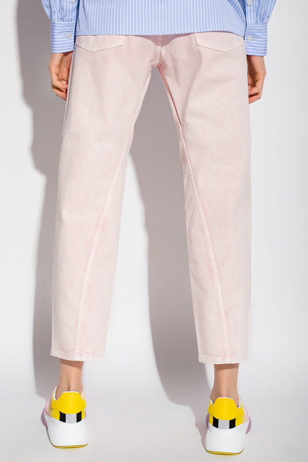 Light pink jeans from Stella McCartney. Embroidered with the brand\'s logo in silver-tone lurex yarn and accentuated with asymmetrical seams, this pair falls with straight legs and features a vintage treatment, a zip fly with a button, classic five pockets and a brown patch at the back.