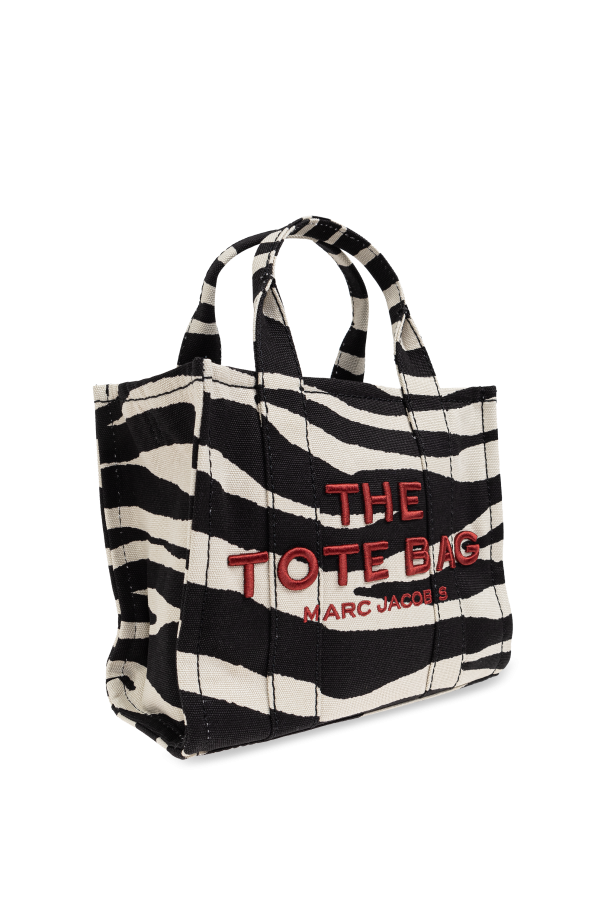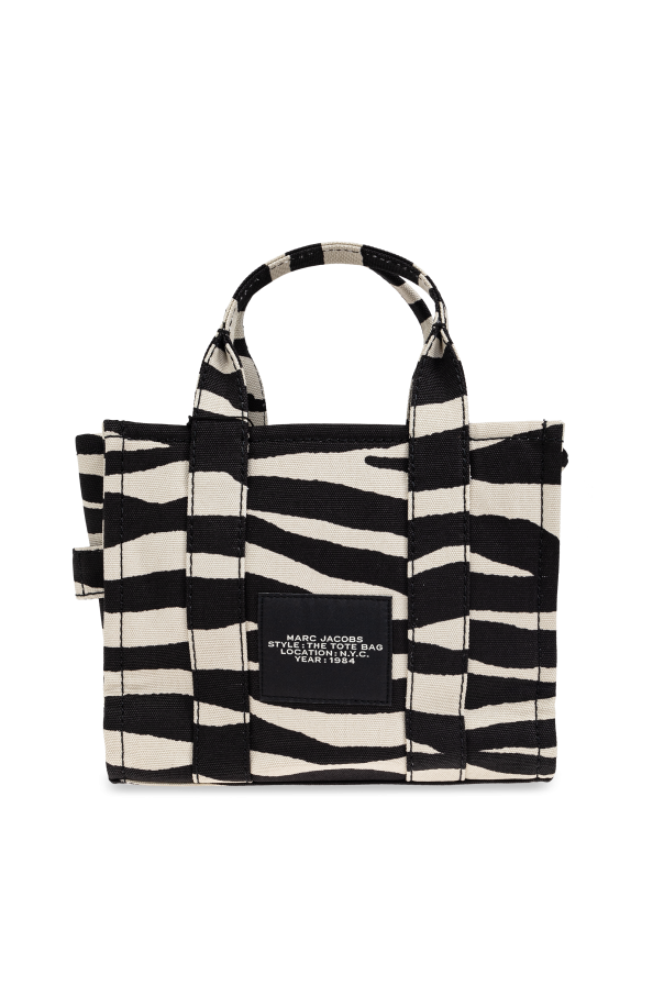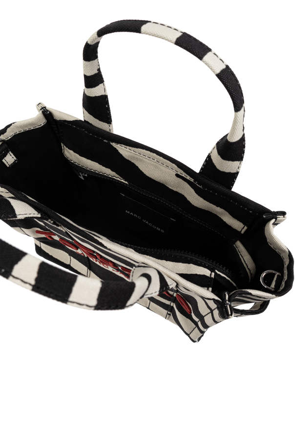 Introducing the exquisite \'The Tote\' shopper bag from the illustrious collection of Marc Jacobs. This striking accessory showcases an enchanting zebra-inspired pattern in timeless black and white hues, exuding an air of sophistication and modernity. Crafted from a fabric reminiscent of canvas, this bag epitomizes both durability and style. The front is adorned with a bold red inscription, \"THE TOTE BAG\", complemented by a subtle \"MARC JACOBS\" logo, adding a touch of distinctive elegance. Designed for versatility, it features two short handles for a classic hand-held look and a detachable wide black strap with a carabiner, allowing for comfortable shoulder wear. The interior is thoughtfully designed with a spacious compartment and a zippered pocket, ensuring your essentials are securely stowed. Why Choose This Product? Iconic design by Marc Jacobs, blending haute couture with everyday elegance. Unique zebra stripe pattern for a modern, chic appearance. Functional with a spacious interior and secure zip closure. Versatile carrying options with handles and a removable shoulder strap.