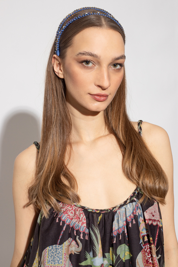 Blue and gold-tone double headband from Red Valentino. Made of brass, this item features woven fabric detailing, a logo-engraved pendant and colourful sparkling crystals.